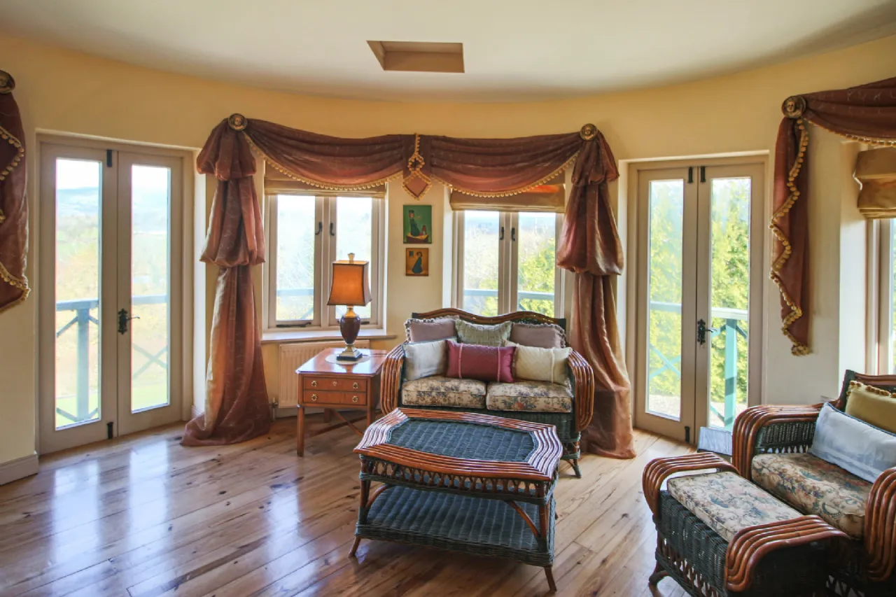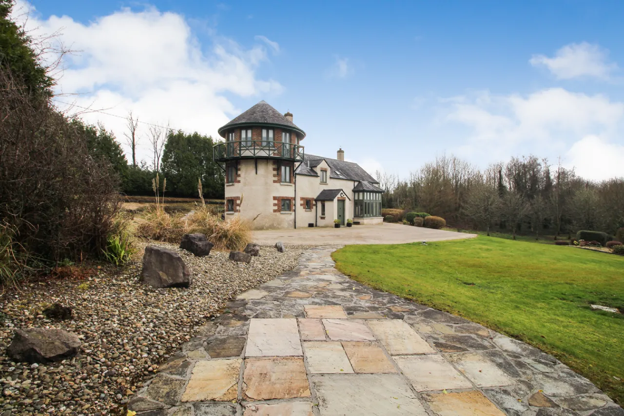 This stunning home delights in so many ways, from its sweeping driveway flanked by lush landscaping, terraced gardens and subtle rockeries, to its most pleasing facade and elevations featuring natural lime render, Donegal sandstone cladding, York handmade brick, authentic Bangor blue Welsh slate, and of course, its tower feature with wrap-around balcony.
