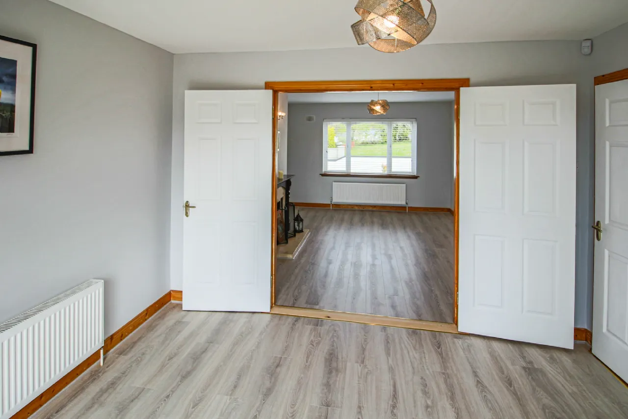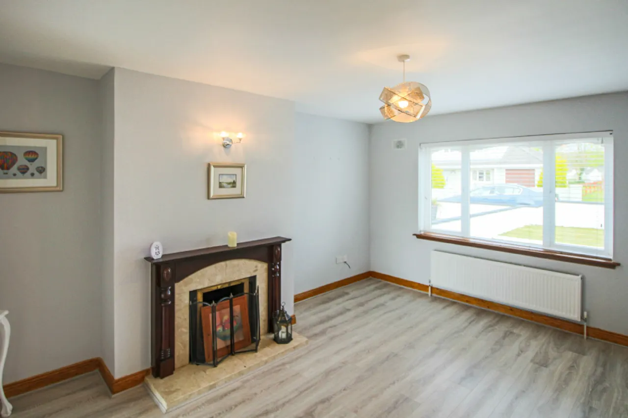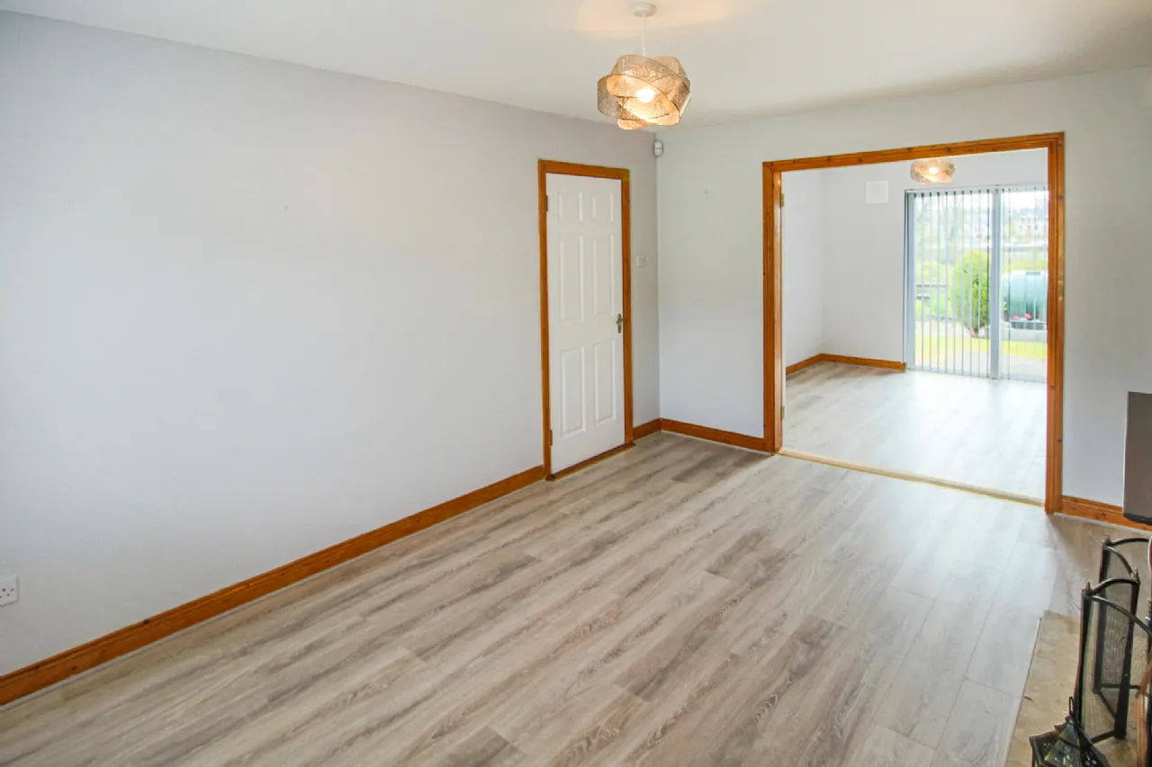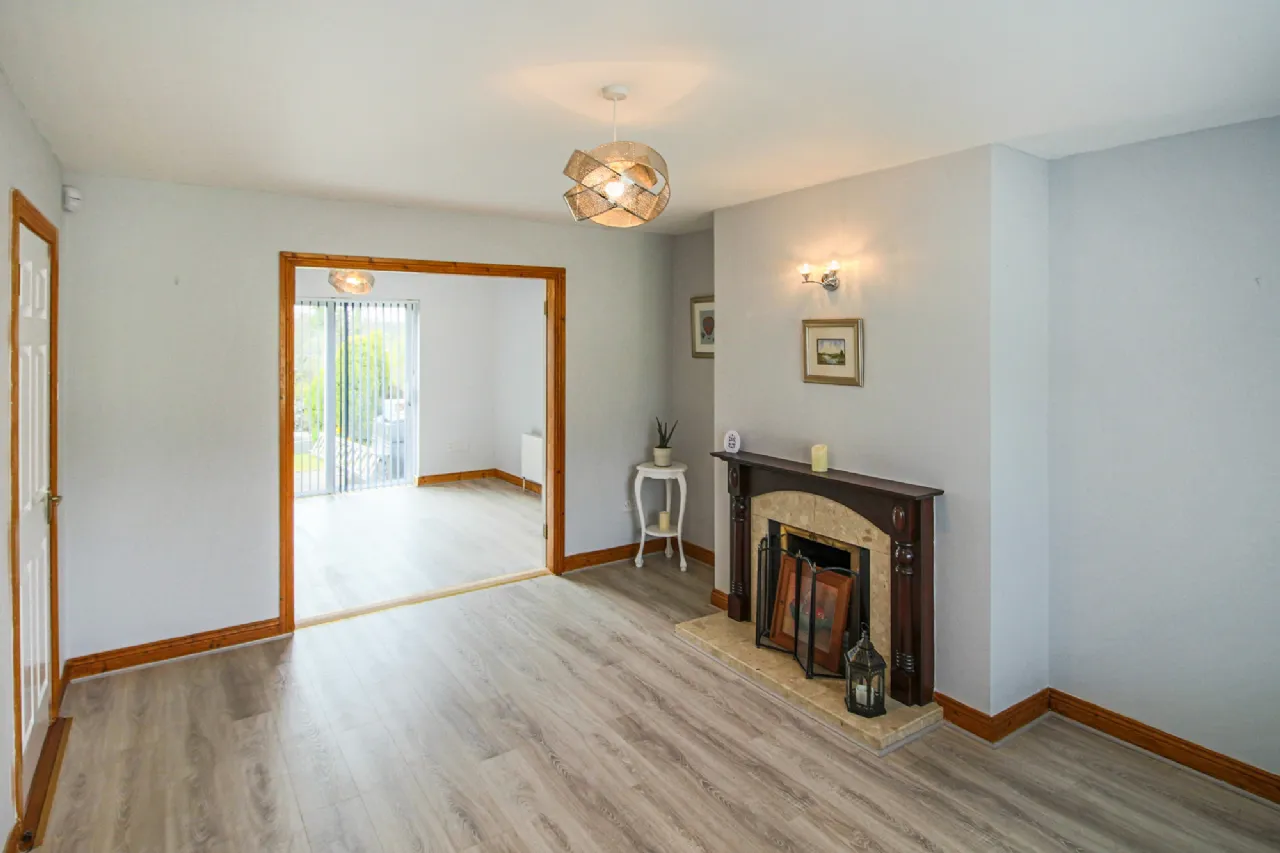 Sittingroom 4.77m x 3.67m Open fireplace with wood surround, granite inset & hearth, 'limed oak' engineered wood flooring, wood slatted blinds, tv & phone points, double doors to TV room/study.