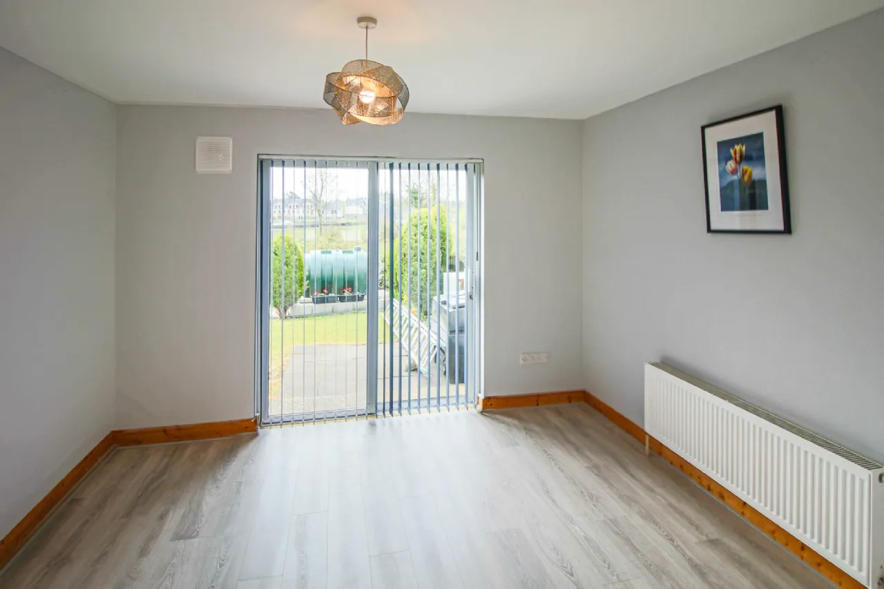 Study 3.65m x 3.42m 'Limed oak' engineered wood flooring, sliding patio doors with vertical blinds.