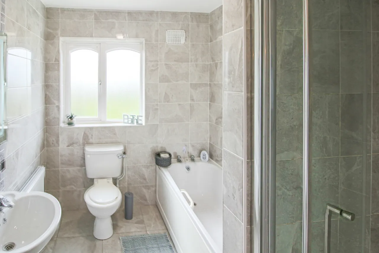 Bathroom 2.83m x 2m Newly, fully tiled, bath, wc&whb, shower enclosure.