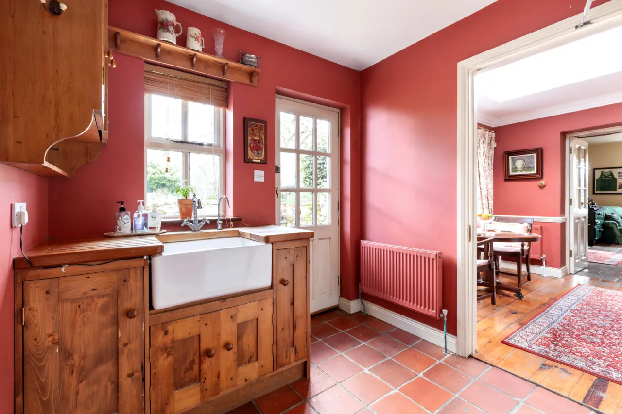 Upstairs there are three spacious double bedrooms one of which is ensuite. Each bedroom is carpeted throughout and has timeless sash windows complemented by matching window shutters. This charming family home offers elegance and comfort. Cosy fireplaces warm the house in winter while the sunny dining room allows enjoyment of the gardens and nature at all times of year.