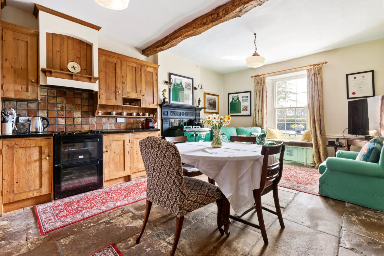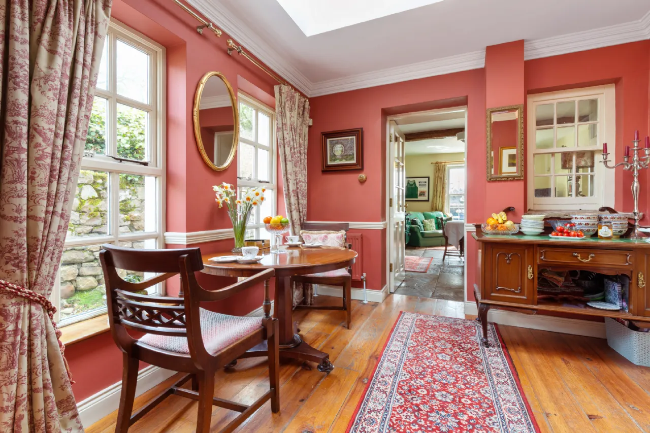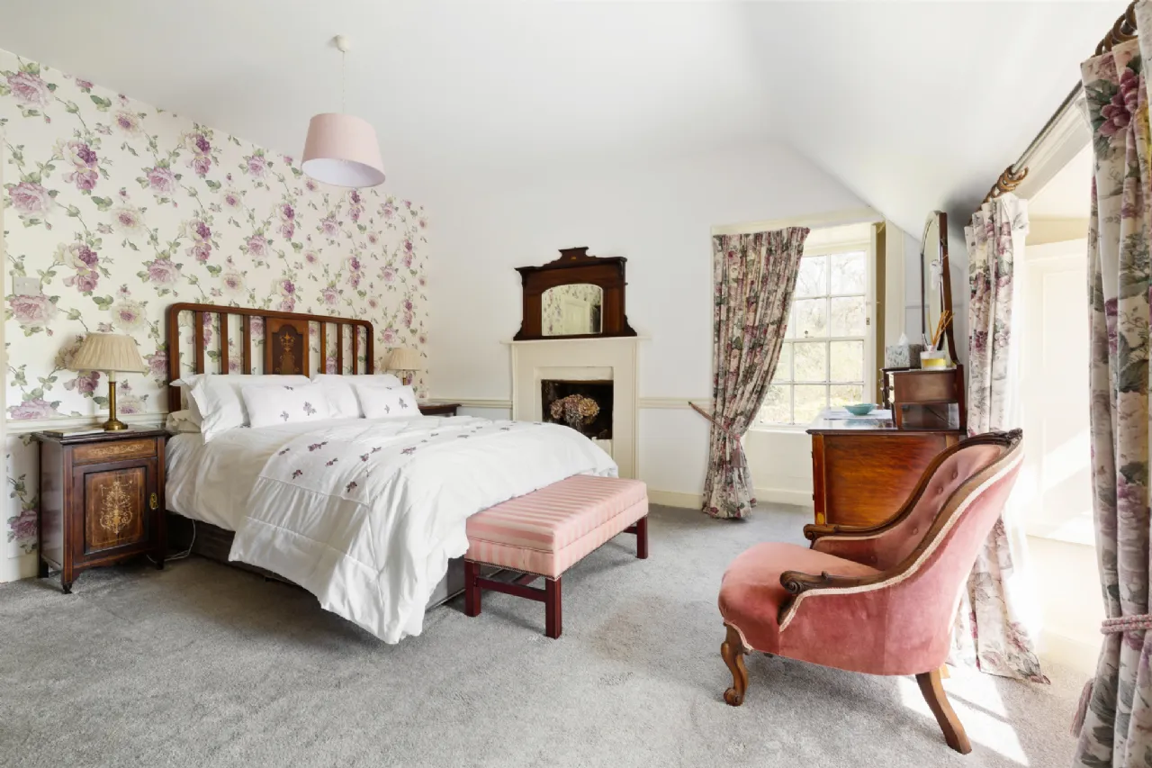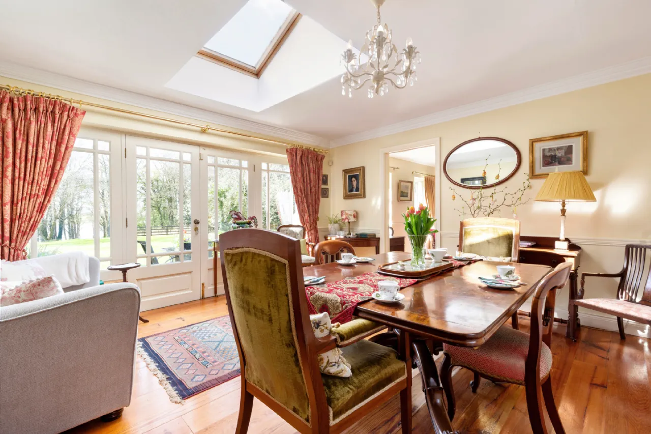 A charmingly decorated entrance hall with classic Victorian tiling welcomes you into Clooncoe House. A front drawing room to the left has a dual aspect, looking on to the lawns and gardens. This space exudes elegance and could comfortably accommodate large parties. On the other side of the hall a door leads to an inner hallway. Off this is the kitchen which holds a Stanley range, exposed ceiling beams and original flagstone flooring, creating a very homely and cosy family space. At the end of the hallway is the magnificent formal dining room. This is a bright and light- filled space with solid wood flooring and large double doors providing a seamless transition onto the patio where one can enjoy views of the water and surrounding countryside. Beyond this lies a generous double bedroom with an ensuite bathroom and views of the magical woodlands.