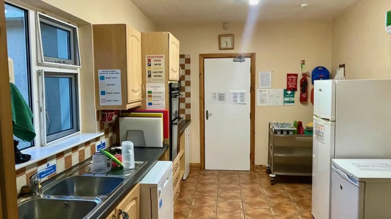 Care Area / Bedroom 2 & 3 6.63m x 4.30m spacious open plan area with linoleum flooring, french doors & 2 sidelights, 3 windows to rear, fitted units and sink