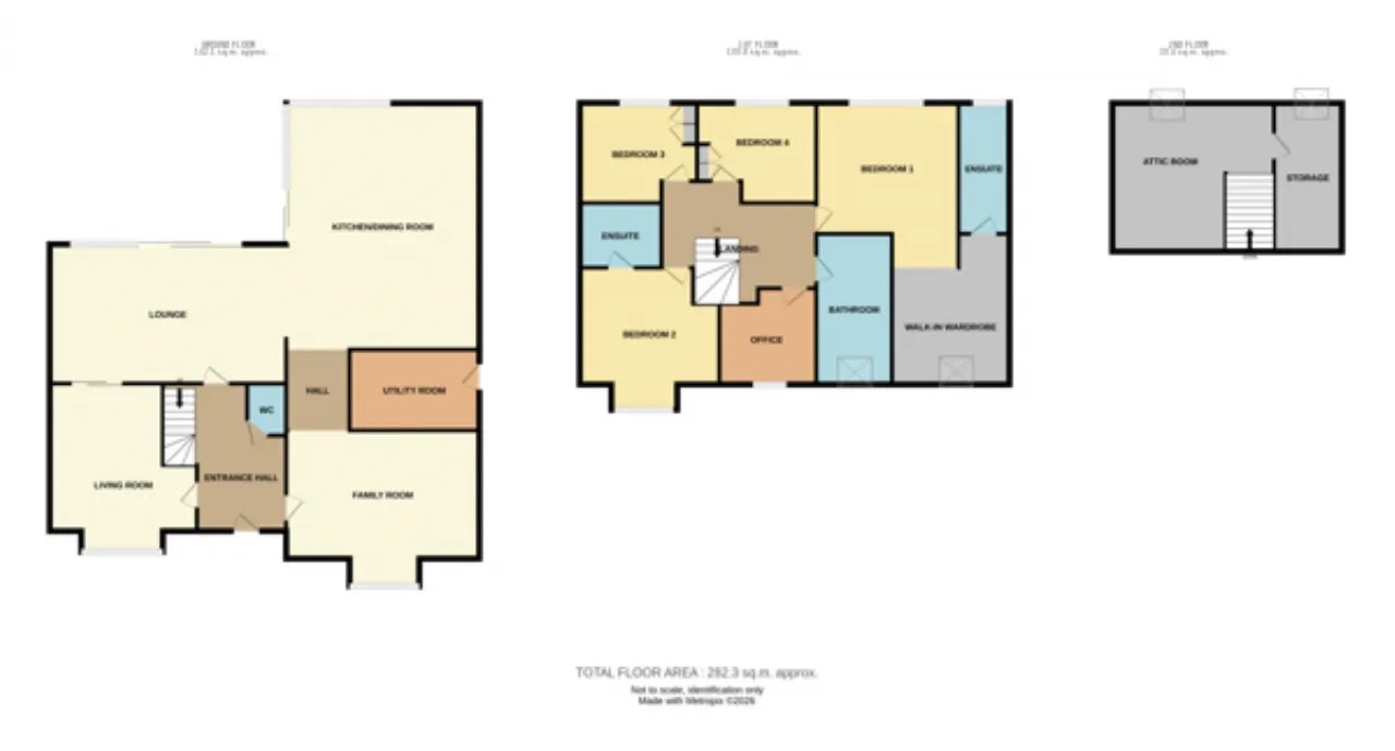 Accommodation: Hallway, Guest wc, Family room, Kitchen Dining Lounge, Utility, Living room, 5 Bedrooms, two ensuite, family bathroom and dressing room. Large attic room and storage room.