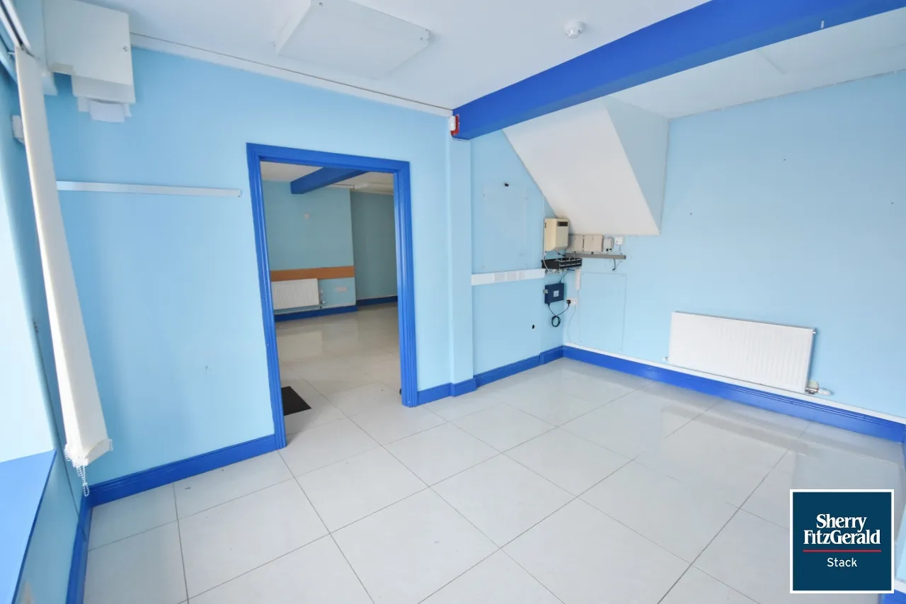 This two storey mid row building comprises 76.57sqm approximately on the ground floor and contains entrance hallway, public office/reception, canteen/stationary room, lobby, 2 offices, shower room with w/c whb and boiler house with stores. On the first floor there is a 2 bedroom apartment (86.63sqm approx) comprising of landing, kitchen/living/dining aread, two double bedrooms (one ensuite) and main bathroom with whb & w/c