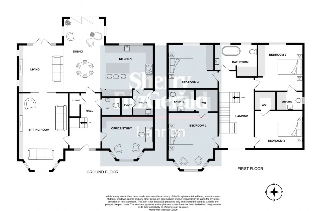 The first floor is equally impressive, comprising four large double bedrooms, two en-suite bathrooms, two walk-in wardrobes, and a well-appointed family bathroom.