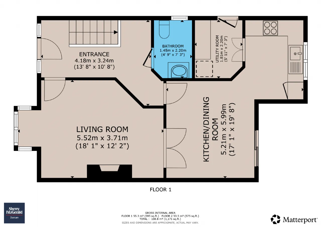 Utility Room 1.8m x 2.2m with porcelain floor tiles, fitted units, fittings for washing machine and dryer, side access door.