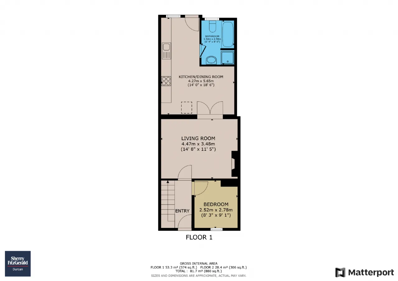The accommodation, which is laid out over two floors, consists of an entrance hallway, bedroom, living room, kitchen / dining room and bathroom on the ground floor while the first floor comprises two additional double bedrooms.