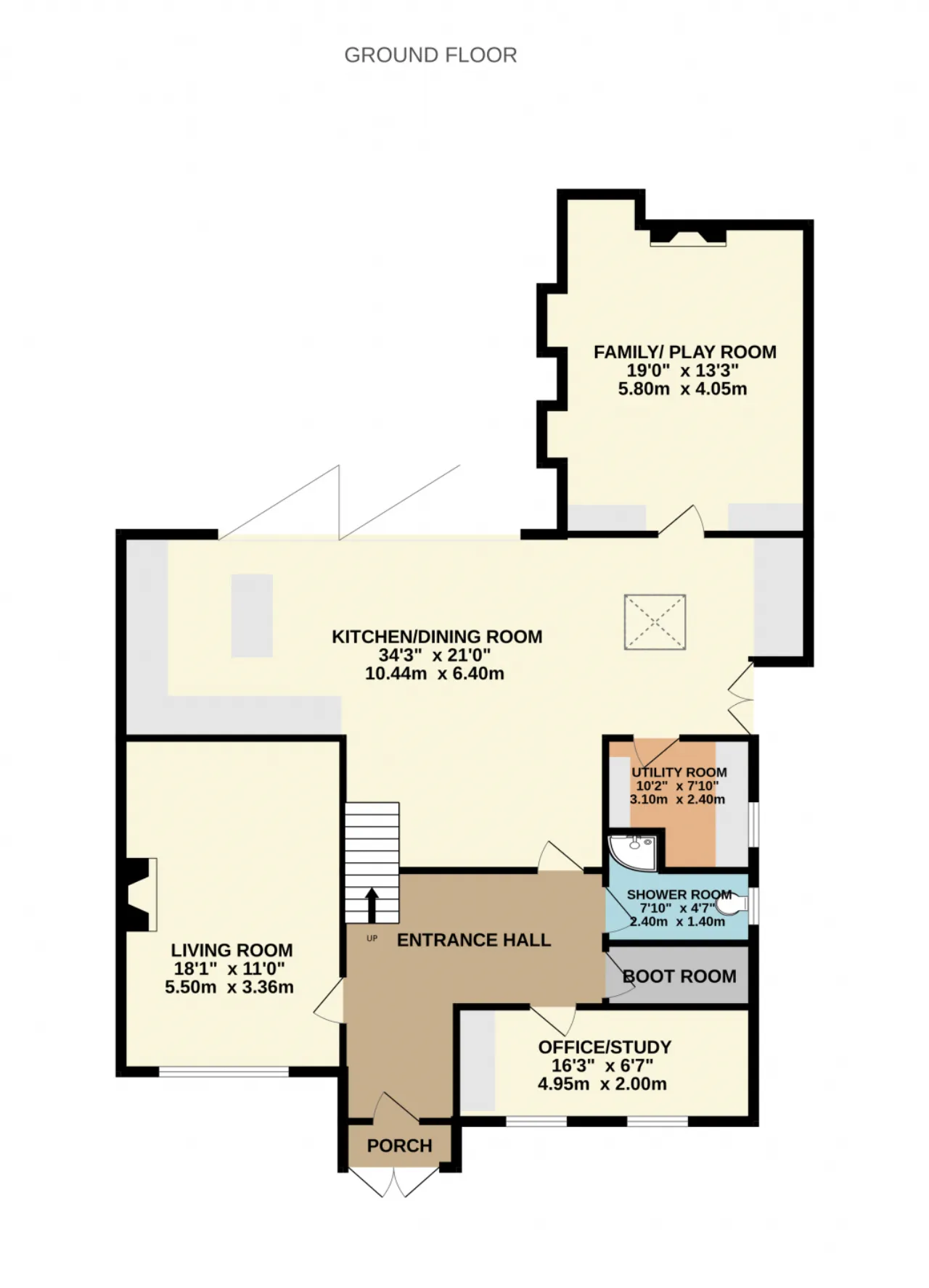 Kitchen/ Dining Room 10.44m 6.40m Housed in a generous extension, with bi-folding doors the room is flooded with natural light. There is a modern kitchen with ample wall hung and floor cabinetry, a large island with breakfast bar. Double oven and 5 ring gas hob. The sizeable room also has ample room for a large dining table and family sitting / tv area with tiled flooring, side door access, and skylight.