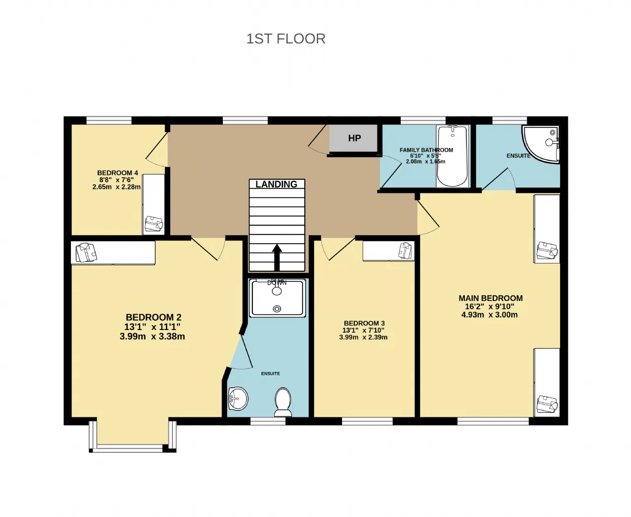 Main Bedroom 4.93m x 3.00m With carpet flooring, built-in wardrobes, dual aspect windows overlooking the green area with ensuite.