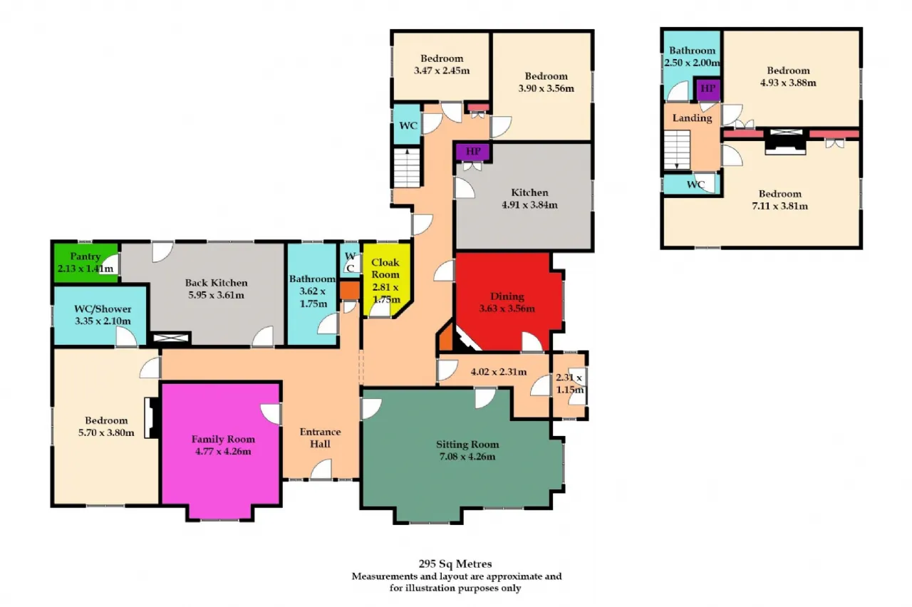 Spacious accommodation offers a generous 297 sq m/ 3197 sq ft which encompasses two front reception rooms, two kitchens, dining room, cloak room, guest w.c. and three bedrooms with main bedroom en-suite. Upstairs features two more double sized bedrooms and a family bathroom completes the floorplan.