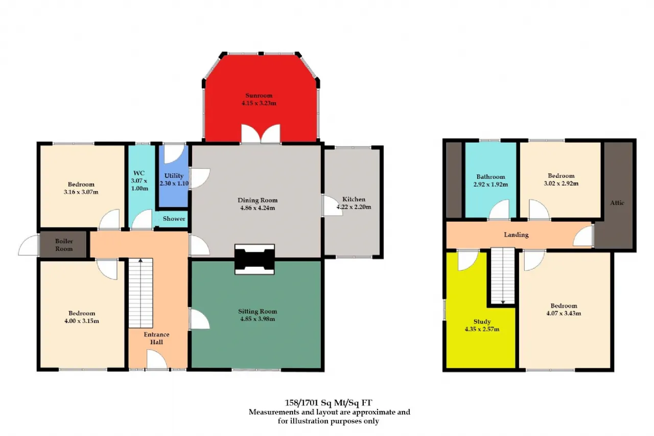 Accommodation comprises an entrance hall, sitting room, dining room, kitchen, sunroom, utility room, shower room, and two ground floor bedrooms. Upstairs, there are two additional bedrooms, a study, and a family bathroom.