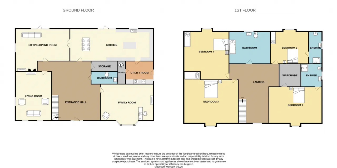 Upstairs you will find four spacious double bedrooms which radiate from a large landing. Two of the bedrooms feature en suite bathrooms while the main bedroom also has a fully fitted walk in wardrobe. The main bathroom raised jacuzzi bath completes the accommodation.