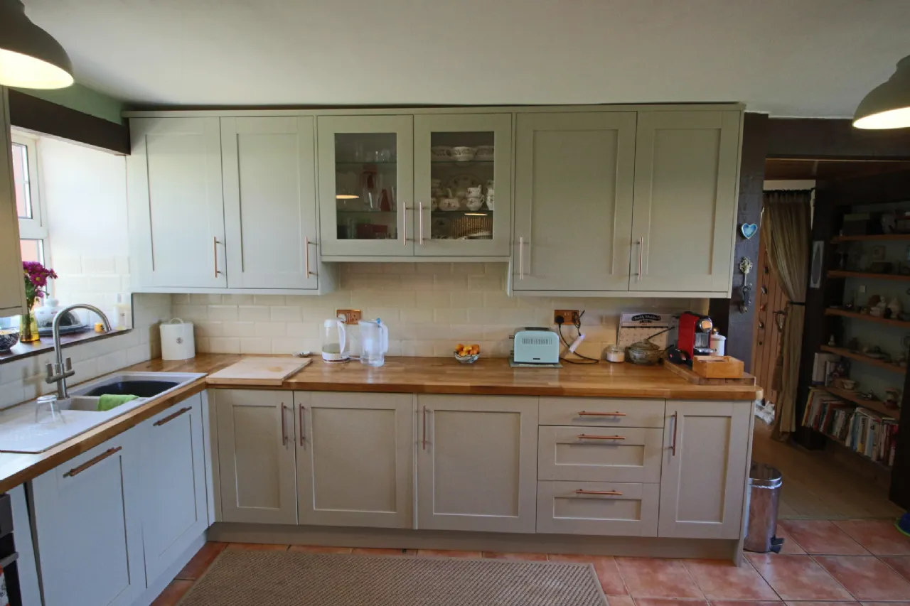 Kitchen 4.69m x 2.88m Quarry style ceramic floor tiles, fitted Shaker kitchen with base and cupboard units with hardwood worktops and subway wall tiling, Rangemaster gas hob, extractor fan, Electrolux ovens, intefrated Normende dishwasher, integrated Normende fridge and separate freezer, hardwood lintels over windows and exposed stone feature, radiator.