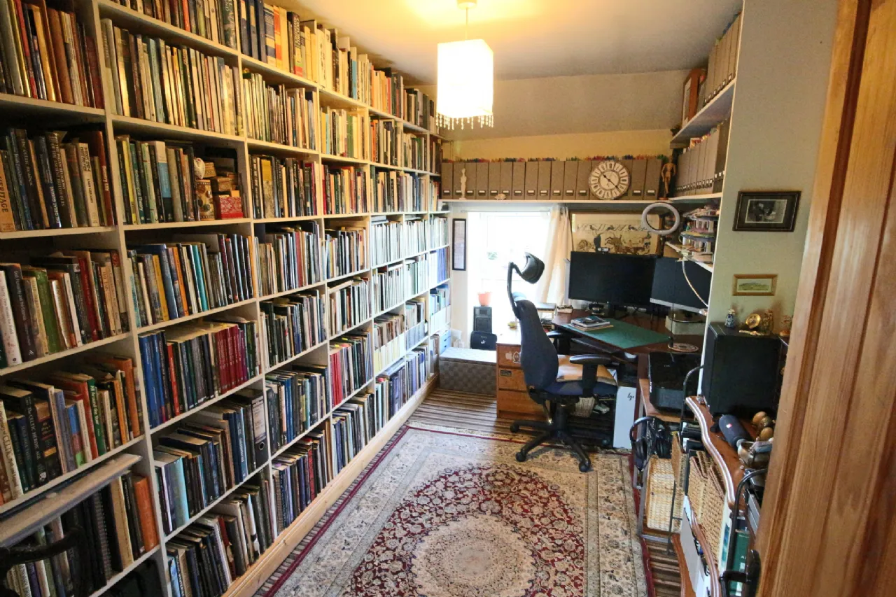 Bedroom 2 / Office 3.94m x 2.35m Extensive wall booking shelving, carpet, radiator.