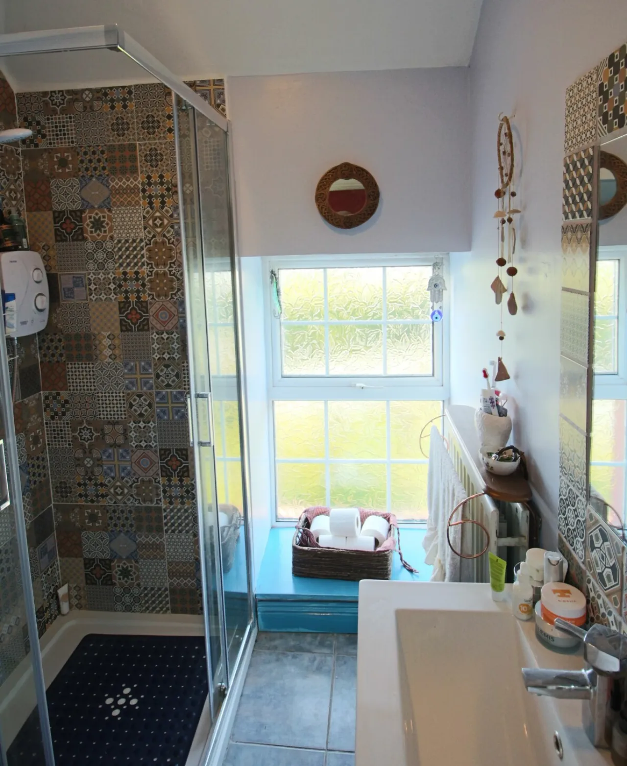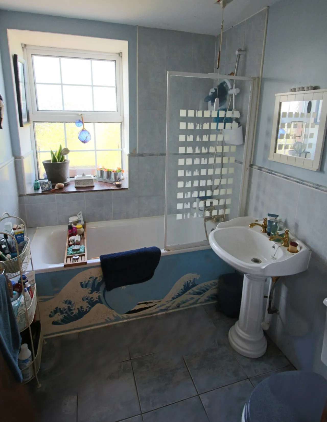 Bathroom 1.50m x 1.61m Floor and wall tiling, wash hand basin over pedestal cabinet, WC, WHB and Triton shower, radiator, wall shelf.