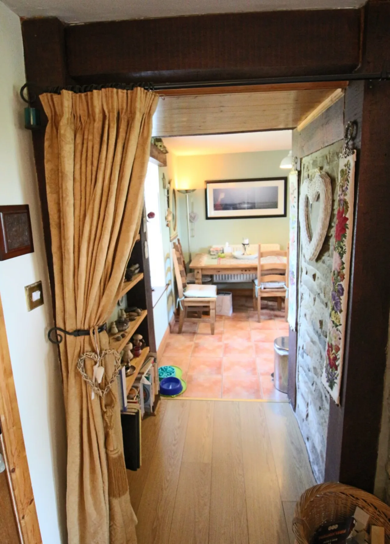 Living Room 4.65m x 4.64m Engineered wood flooring, features include exposed wood lintels, fireplace with natural stone surround and chimney breast. Tiffany style wall sconces, good natural light from 3 windows, wrought iron curtain pole and drape.