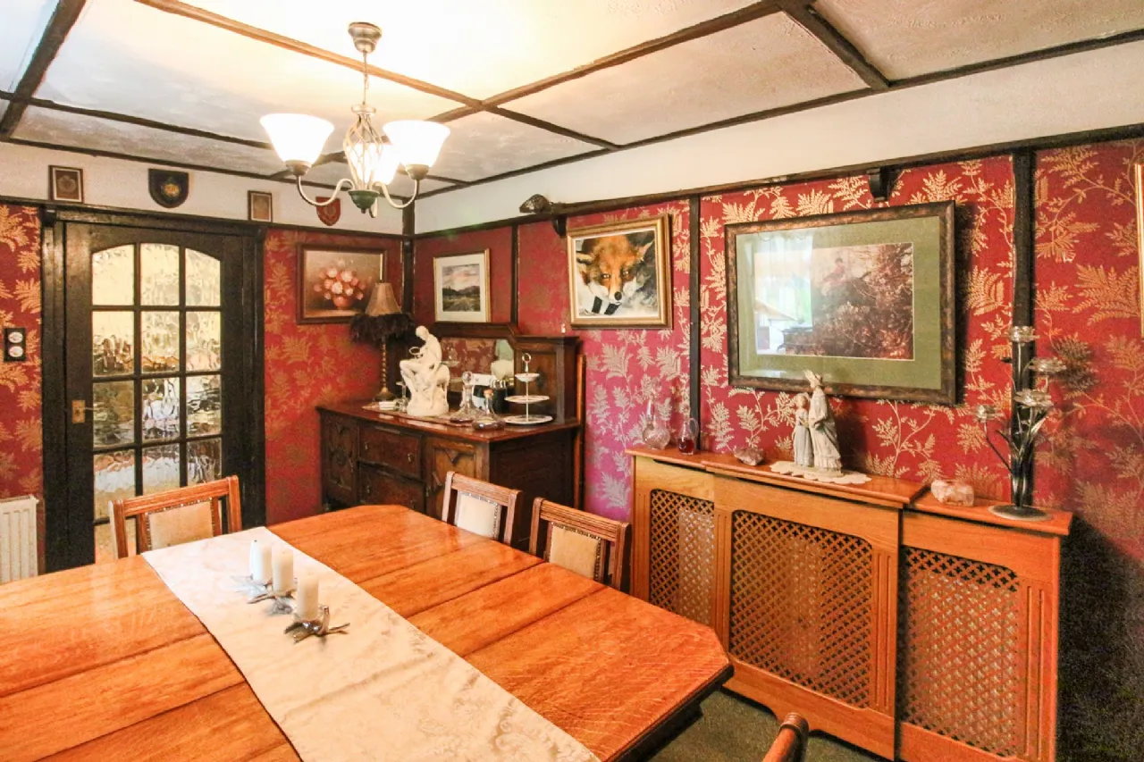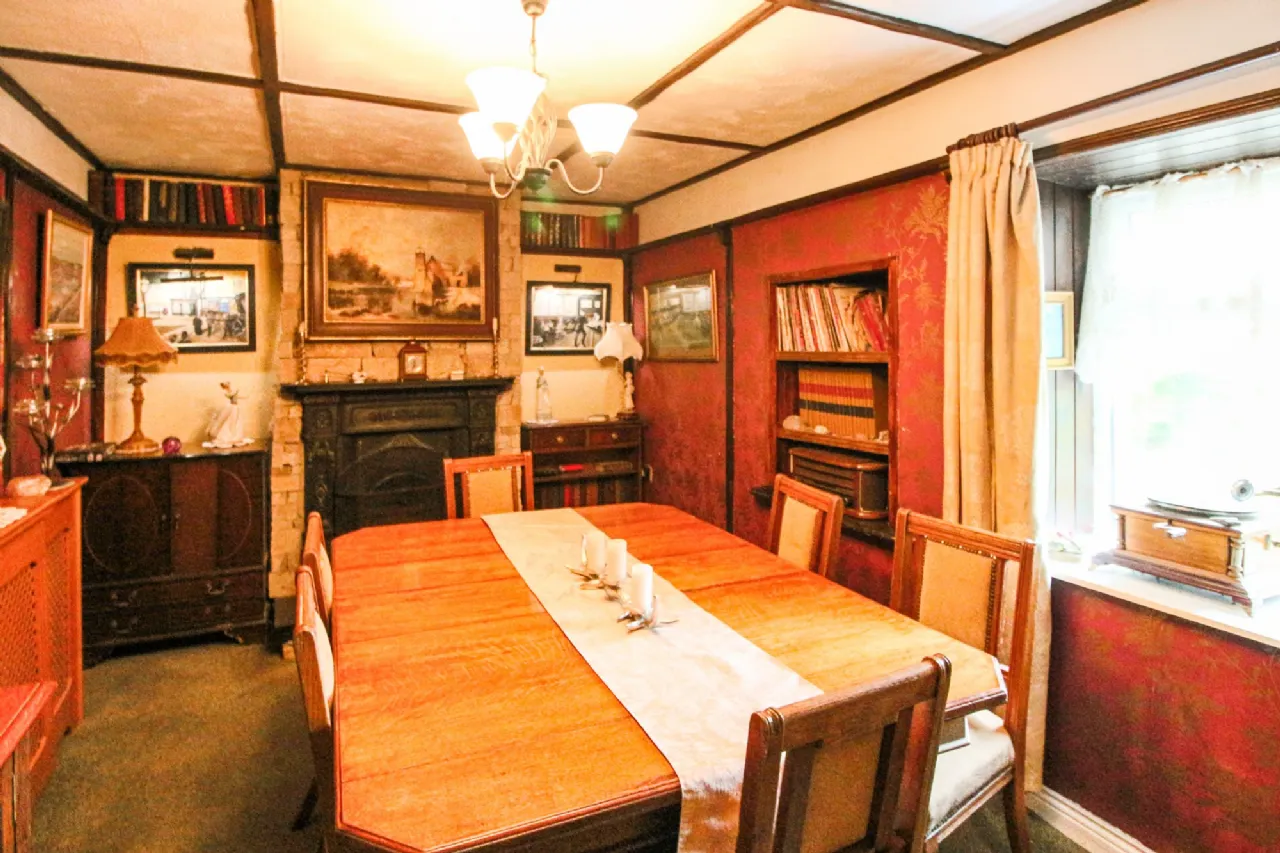 Dining Room 4.64m x 2.94m Radiator with cabinet, beamed ceiling feature, glazed door, stone chimney breast, cast iron fireplace with granite hearth, feature wallpaper & wood frame shelves to two walls, recessed shelving. Book shelves on both sides of fireplace, radiators x2.