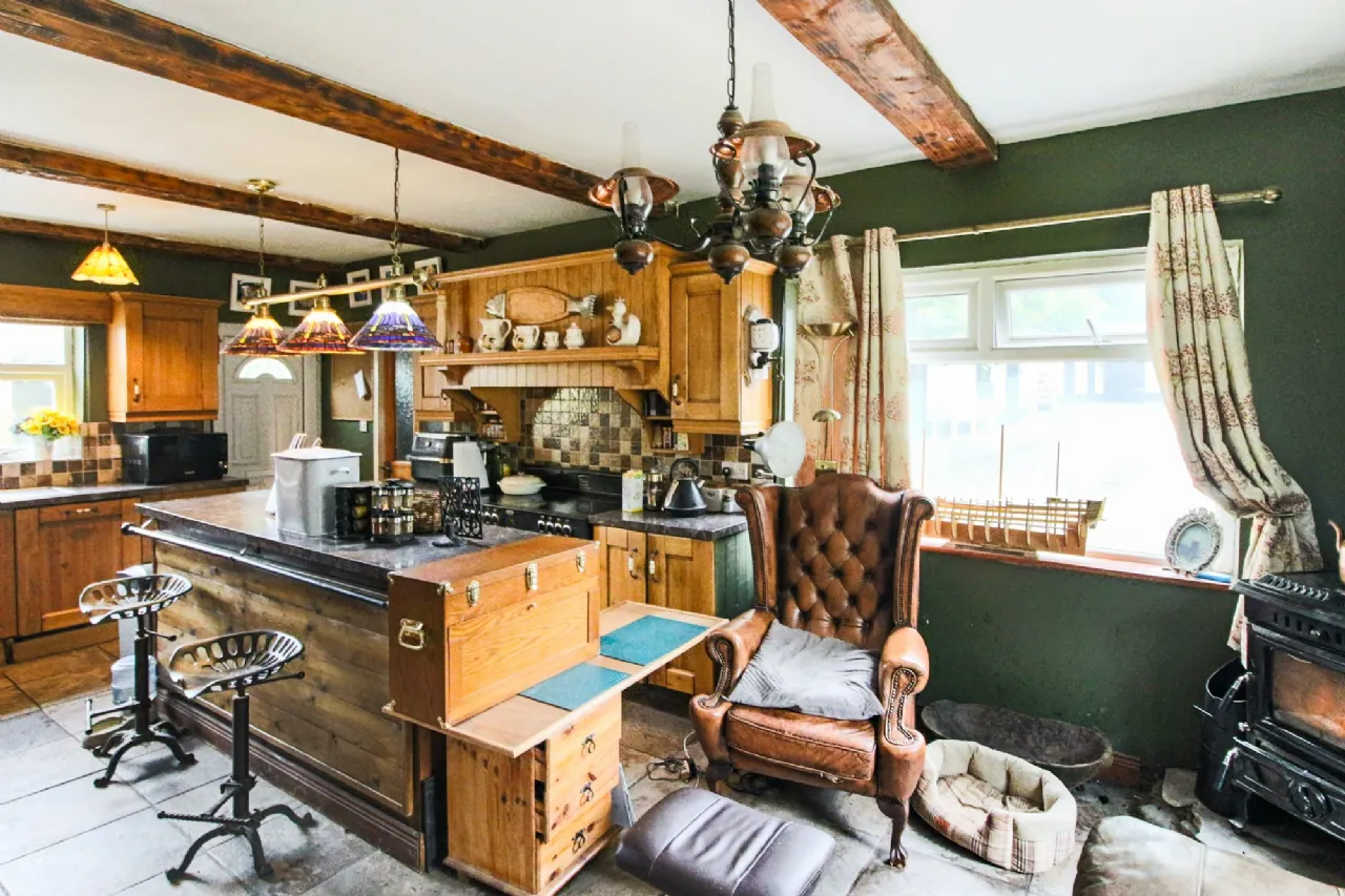 Kitchen/Dining/Living Room 27.45m² (295.47 sq ft) Flagged floor, bespoke 'oak' units with antique brass & porcelain handles, island/breakfast bar with metal hanging rail, integrated Kenwood dishwasher, Belling electric cooker & hob, 'Classic' integrated fridge freezer, feature Tiffany-style light fitting, larder cupboard, beamed ceiling, door with cat/dog flap, standalone solid fuel stove, radiator, recessed TV nook, spot lamps, curtain poles, access to loft space.