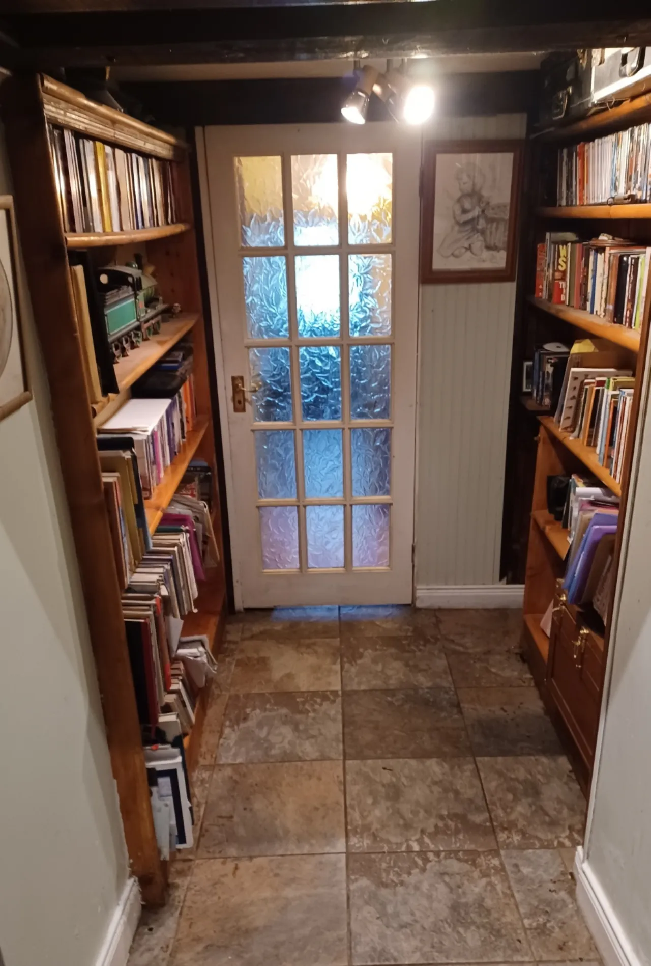 Utility Room 2.8m x 2.4m Flagged floor, t&g ceiling, half glazed door, wainscotting, washer/dryer cupboard.