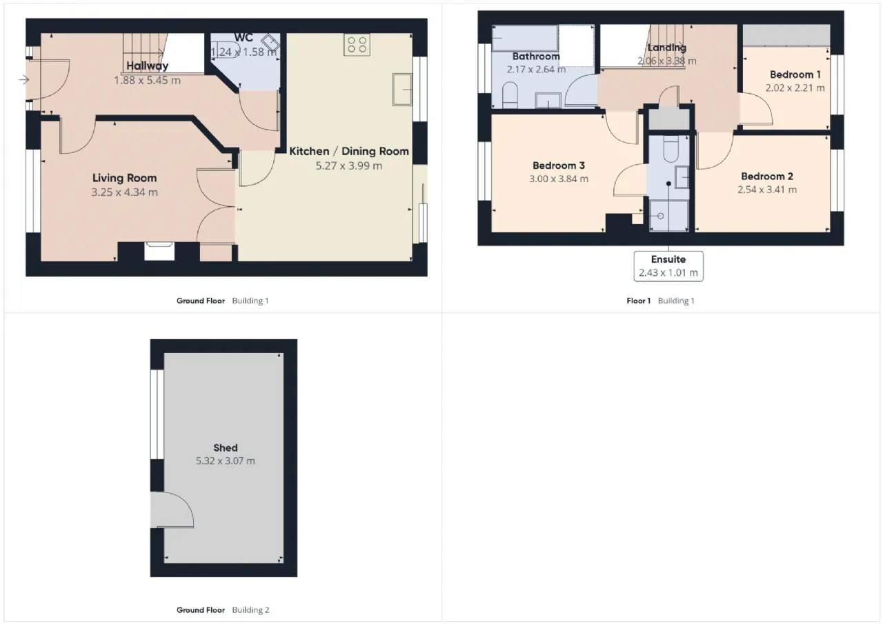 Ensuite 2.43m x 1.01m tiled, wc, handbasin and electric shower