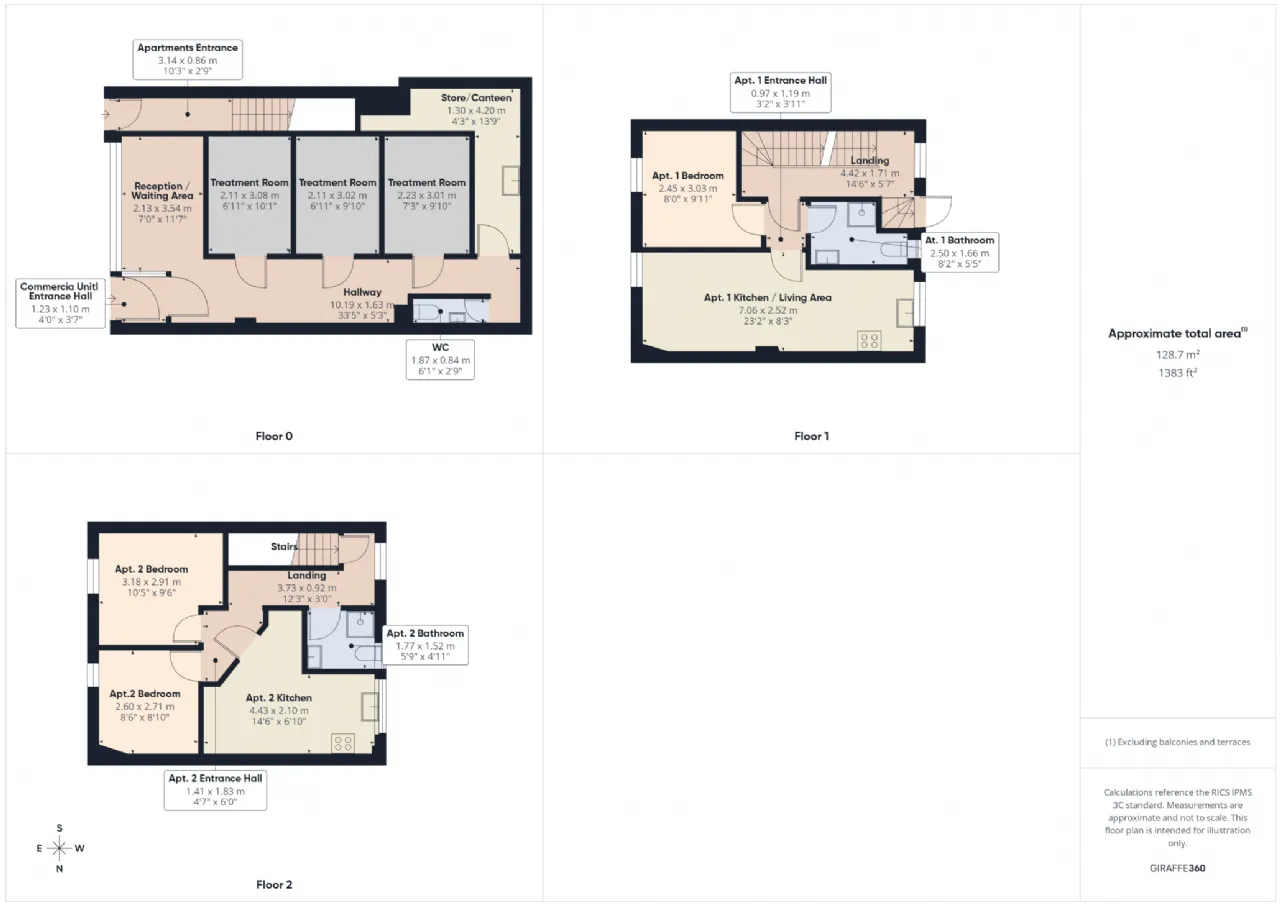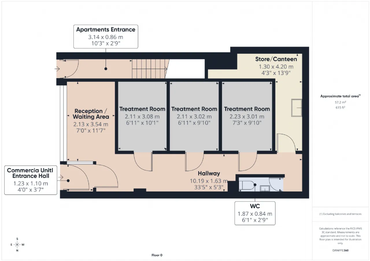 Entrance hall, reception/waiting room area, 3x treatment rooms, store/canteen and WC.
