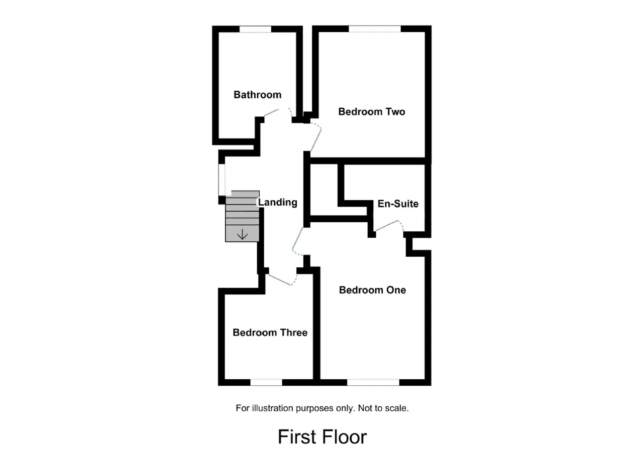 Upstairs, there are three bedrooms — each with built-in wardrobes and carpet flooring — the primary bedroom with bay windows and a modern en-suite bathroom. The main family bathroom is fully tiled and features a bath, WC, wash hand basin, and heated towel rack.