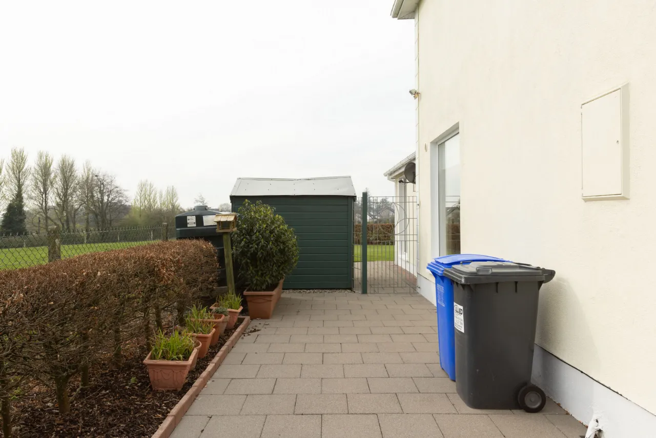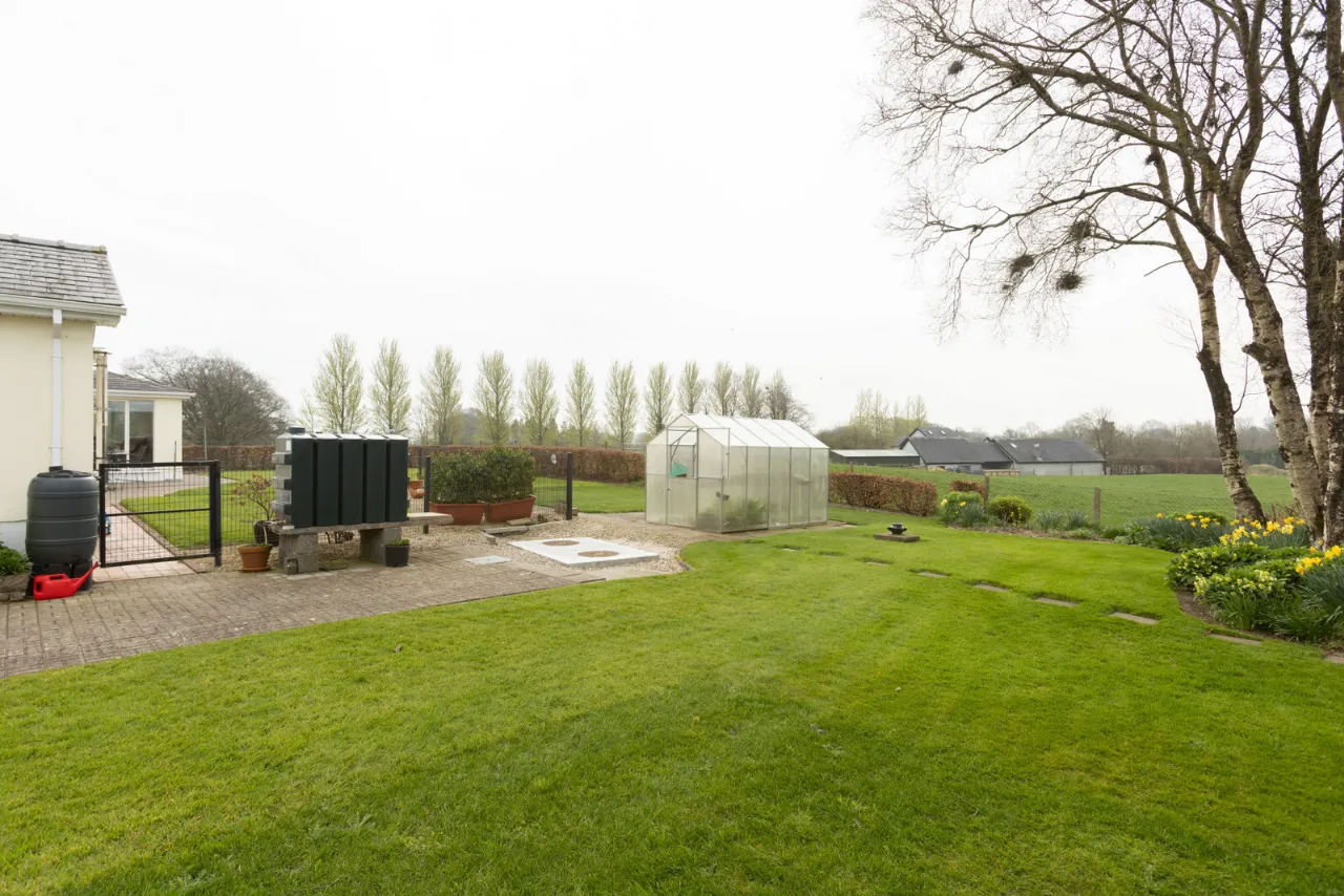 A cobblelock driveway with gated side entrance leads to the large attached garage, which is wired for power and features a new composite door and electric roller shutter. The gardens, framed by mature trees and shrubs, offer a private haven, with a sunny south-facing aspect, patio area, and unobstructed rural views. The site is fully landscaped and not overlooked, bordered by a charming stone-cut wall at the entrance.