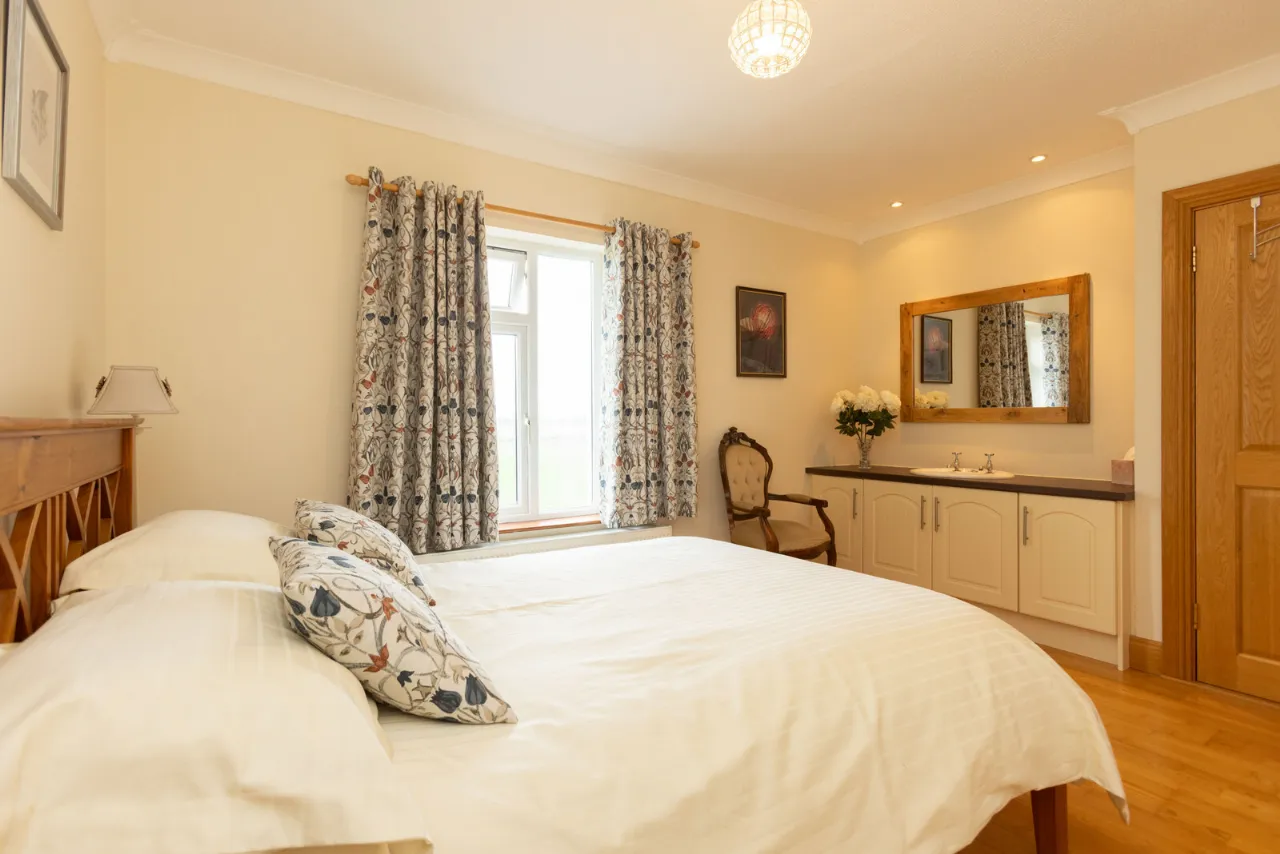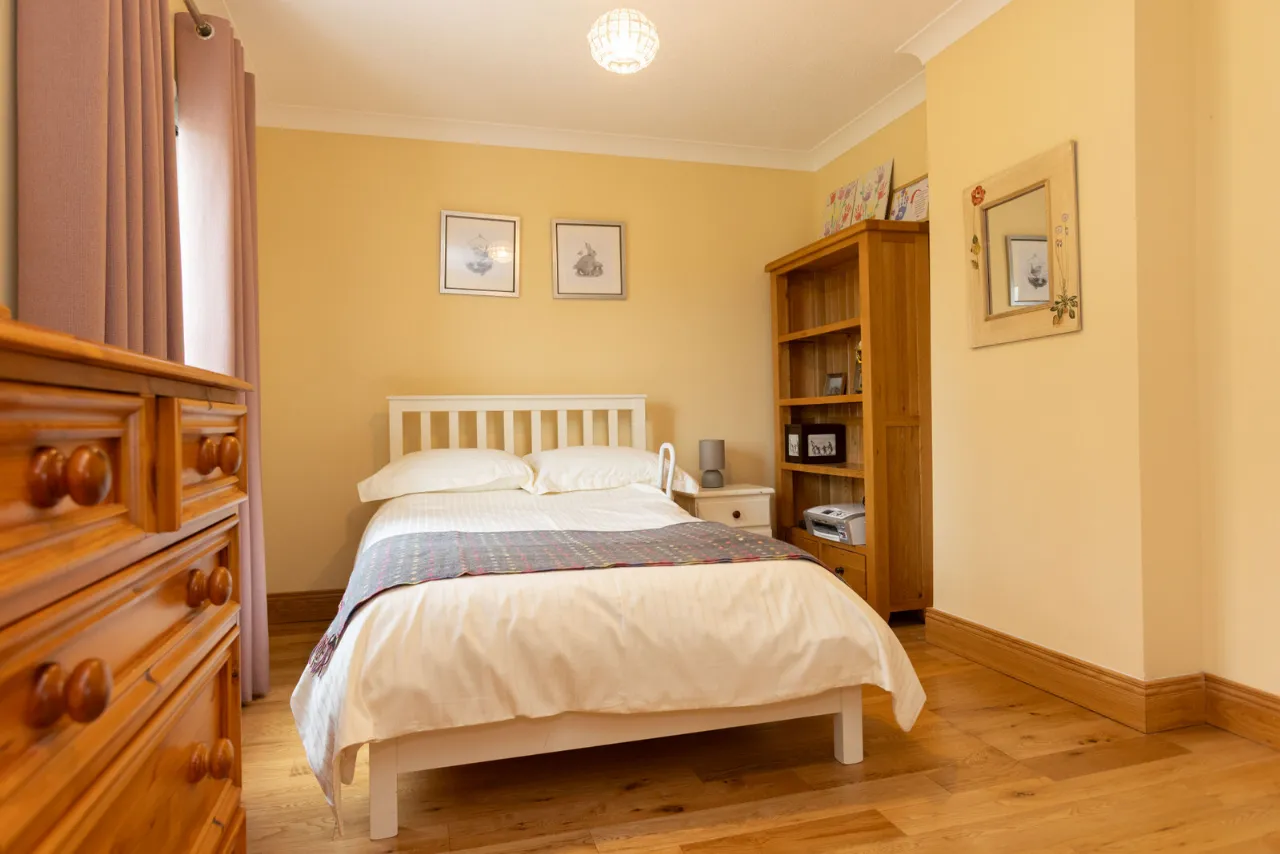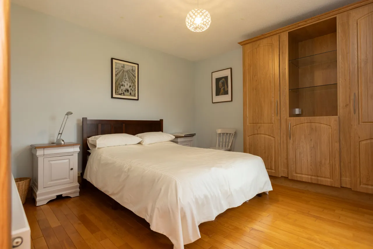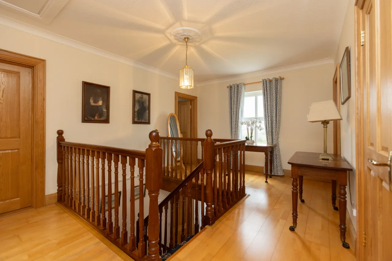 Upstairs, the light-filled landing provides access to four generously sized bedrooms. The primary features built-in wardrobes and a fitted dresser with sink, while the remaining bedrooms are equally well-appointed with ample storage. A modern main bathroom completes the upper level, fully tiled with electric shower and high-quality sanitaryware.