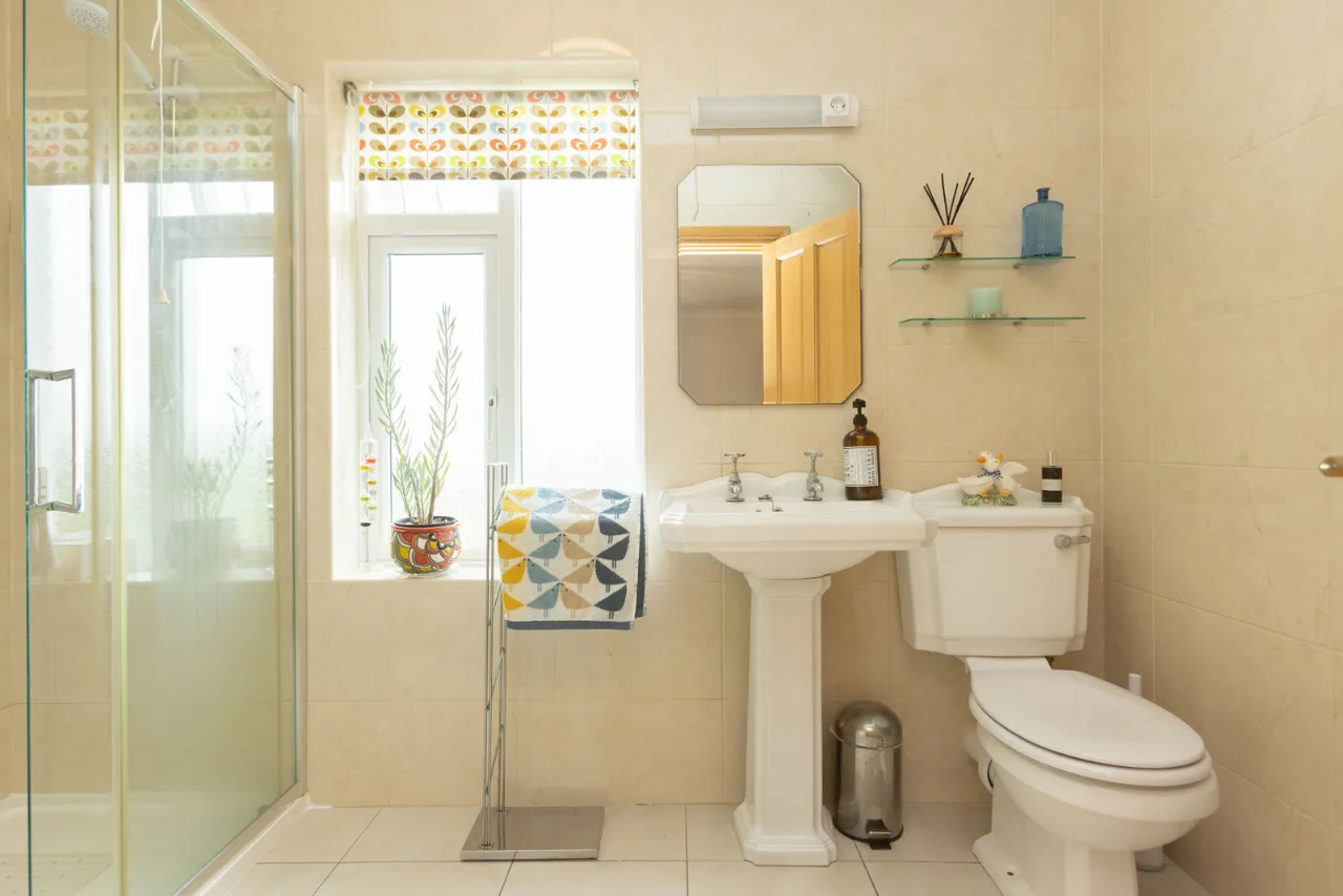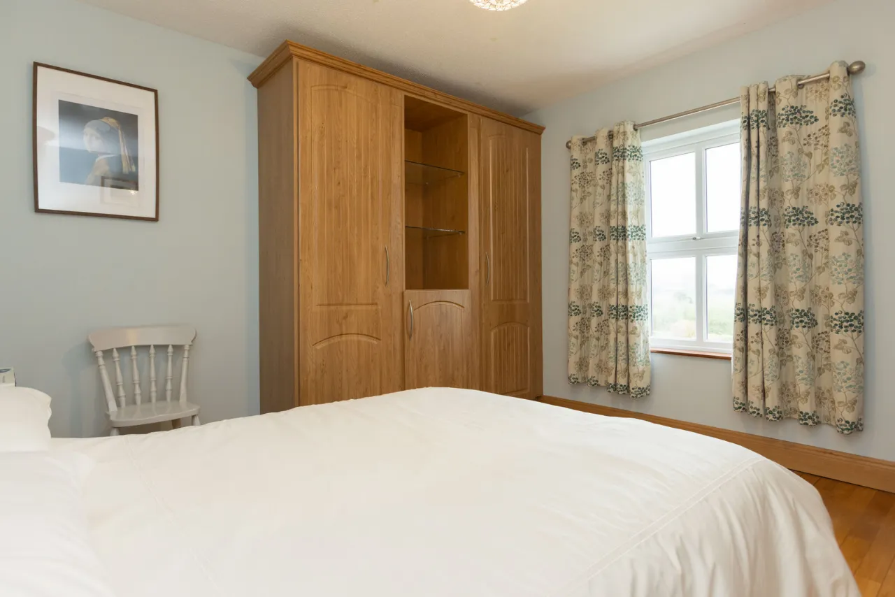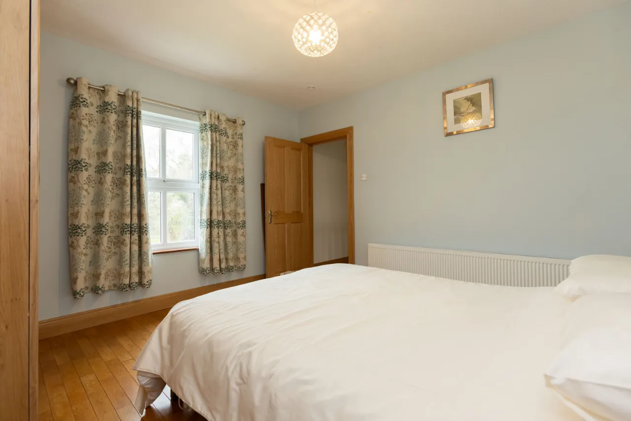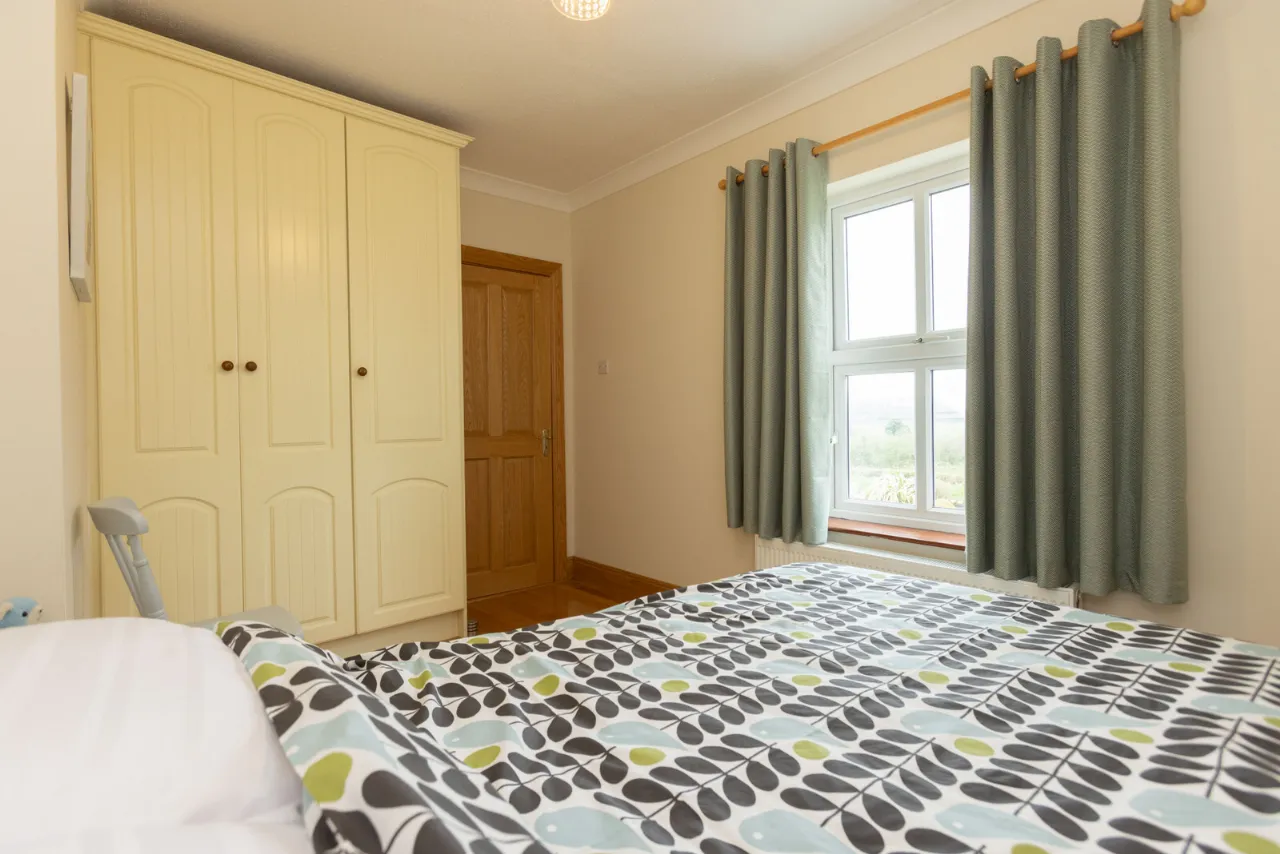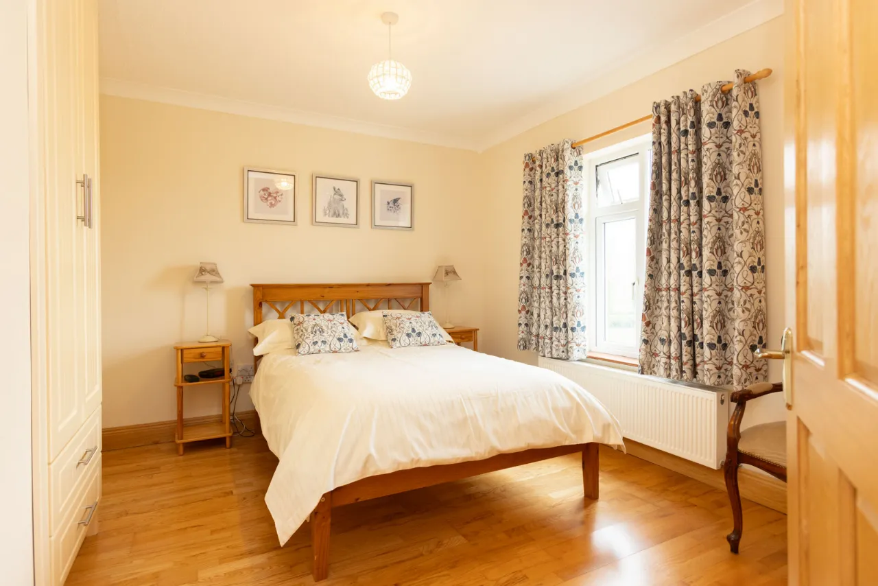 Upstairs, the light-filled landing provides access to four generously sized bedrooms. The primary features built-in wardrobes and a fitted dresser with sink, while the remaining bedrooms are equally well-appointed with ample storage. A modern main bathroom completes the upper level, fully tiled with electric shower and high-quality sanitaryware.