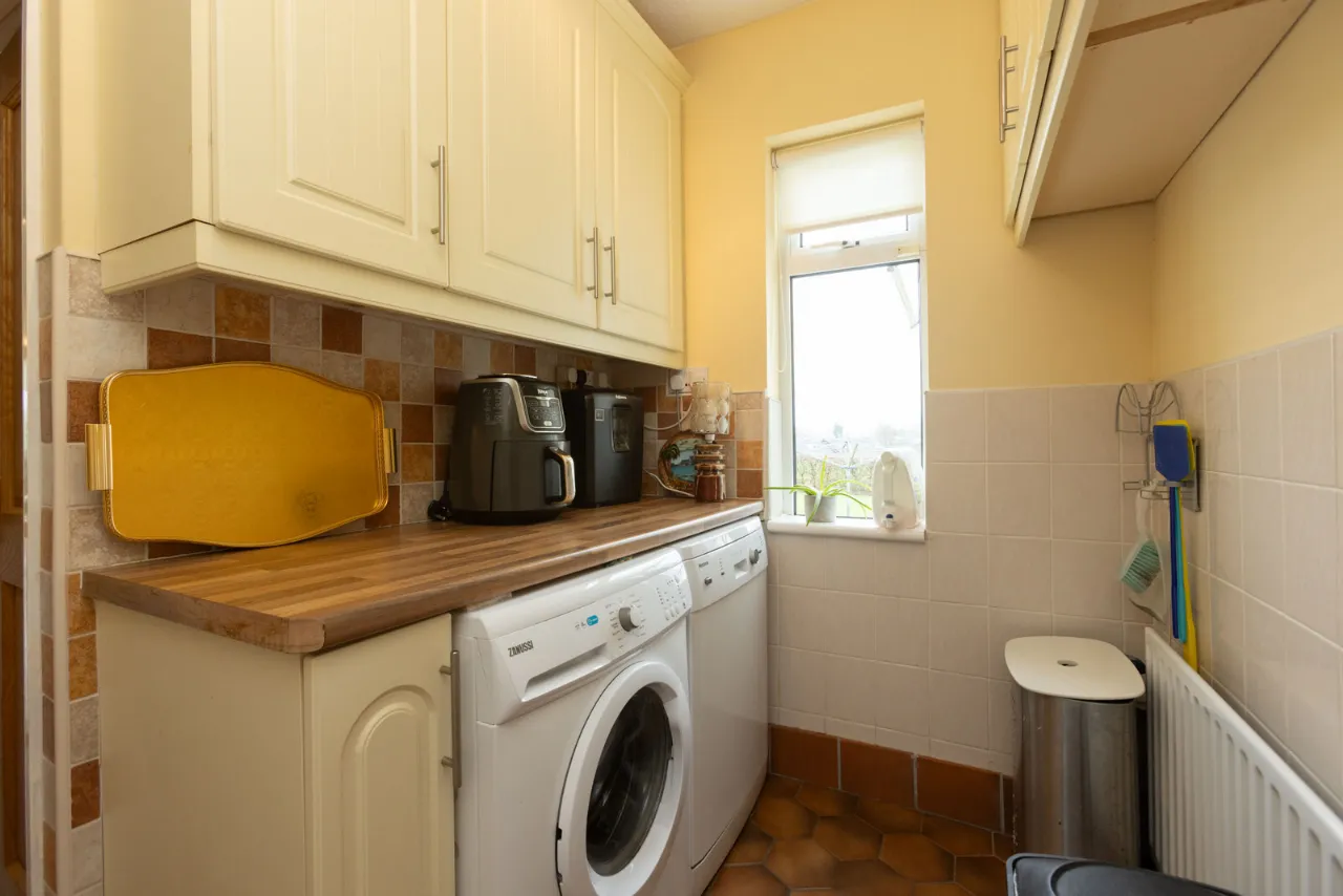 Utility Room 2.35m x 3.62m Tiled floor, wall tiling, fitted storage units, plumbed for washer/dryer.