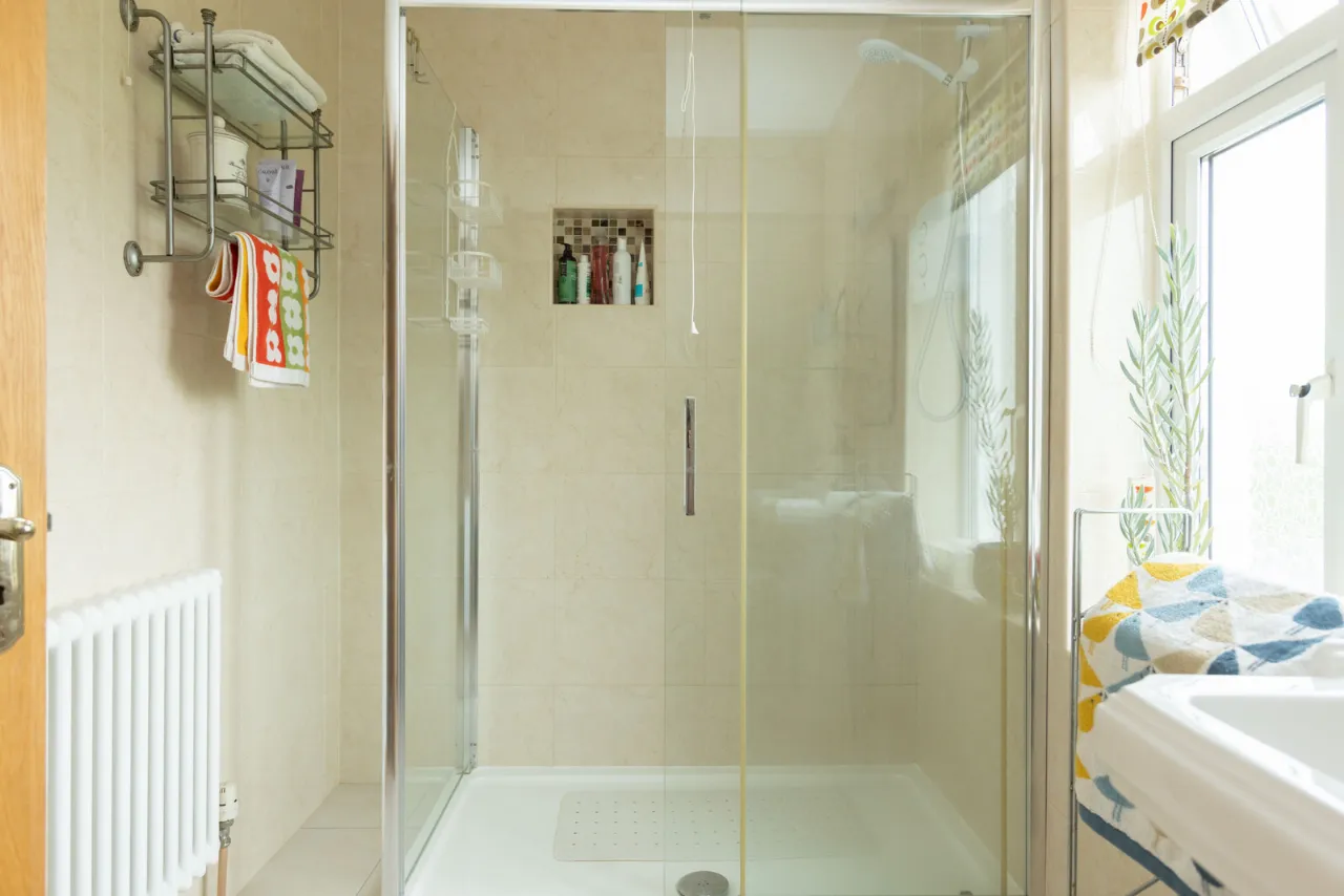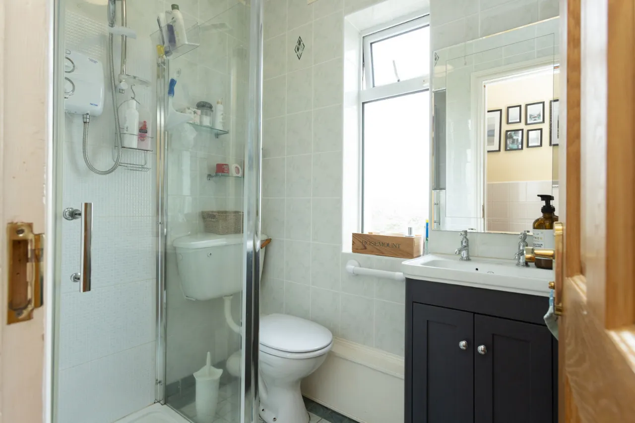 Bathroom 2.11m x 3.01m Tiled floor, wall tiling, WC, wash hand basin, spotlight, tiled electric shower.