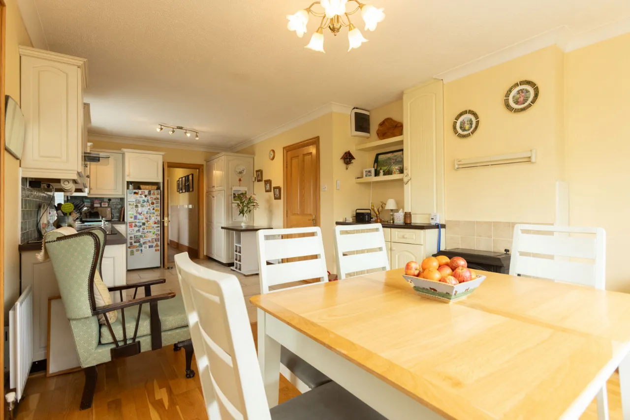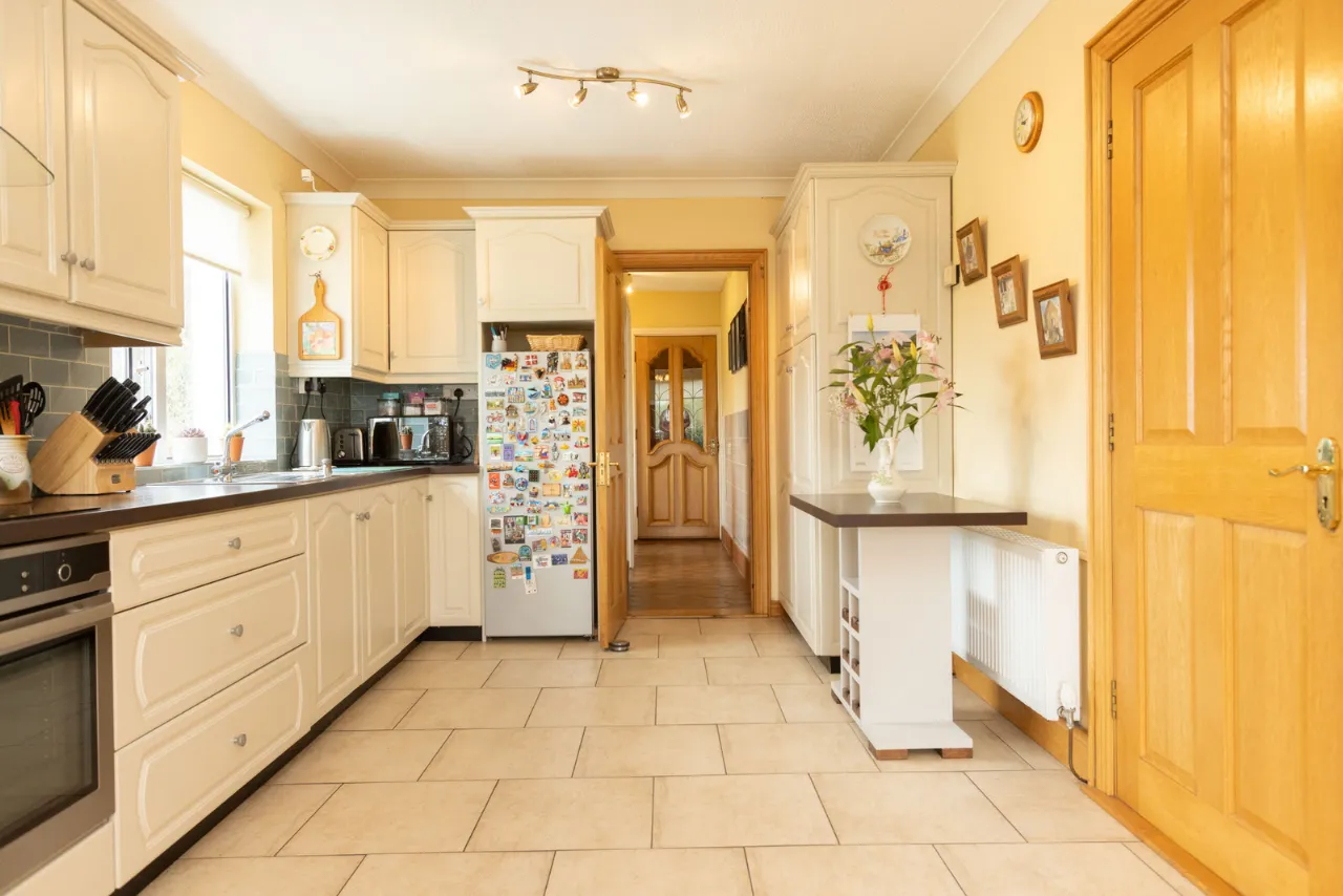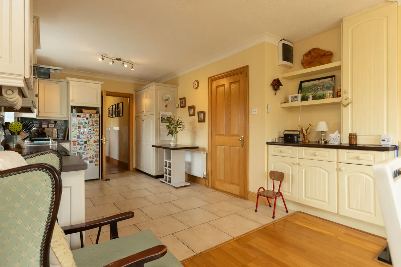 Kitchen/Dining 2.98m x 7.4m Tiled floor, in kitchen, laminate floor in dining area, spotlings, coving, fully fitted kitchen with tiled backsplash, oil stove with water heating, double doors to family room.