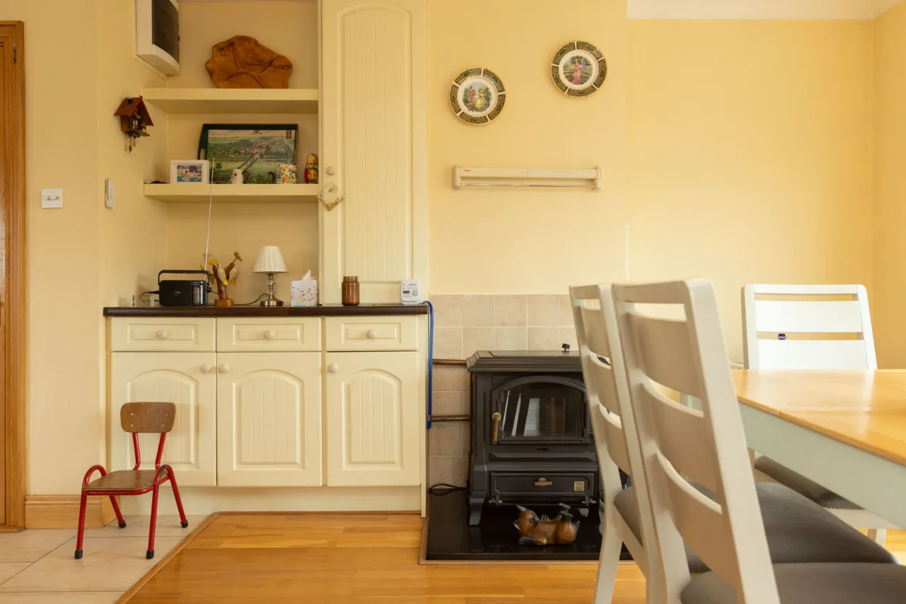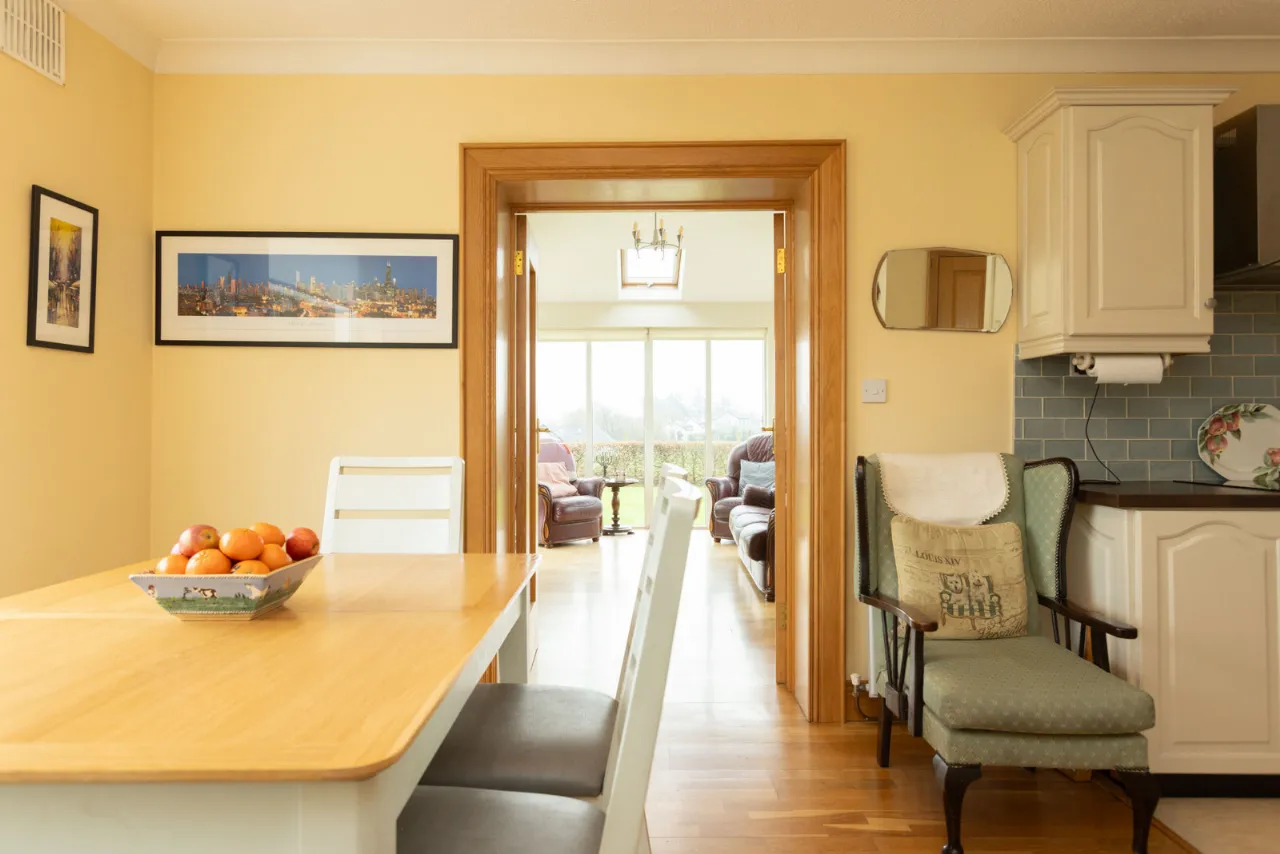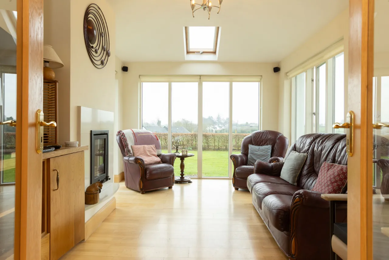 The open-plan kitchen and dining area, with fully fitted kitchen with tiled backsplash and oil stove flows into the dining space, leading through double doors to a bright and airy family room. This impressive space boasts floor-to-ceiling windows, a skylight, and panoramic views of the surrounding countryside complete with another inset stove.