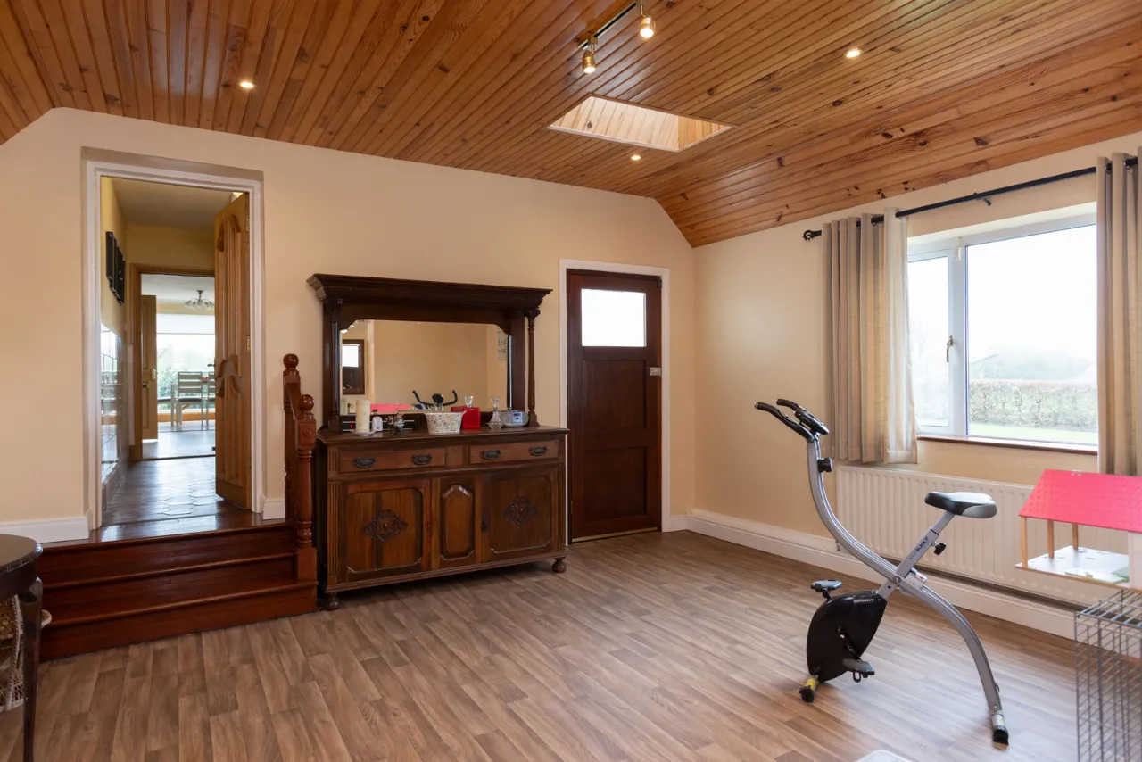 Family Room 4.59m x 3.25m Laminate floor, feature lighting, double glass panel doors, inset solid fuel stove, skyight, floor to ceiling windows offering great natural lighting and views of surrounding countryside.