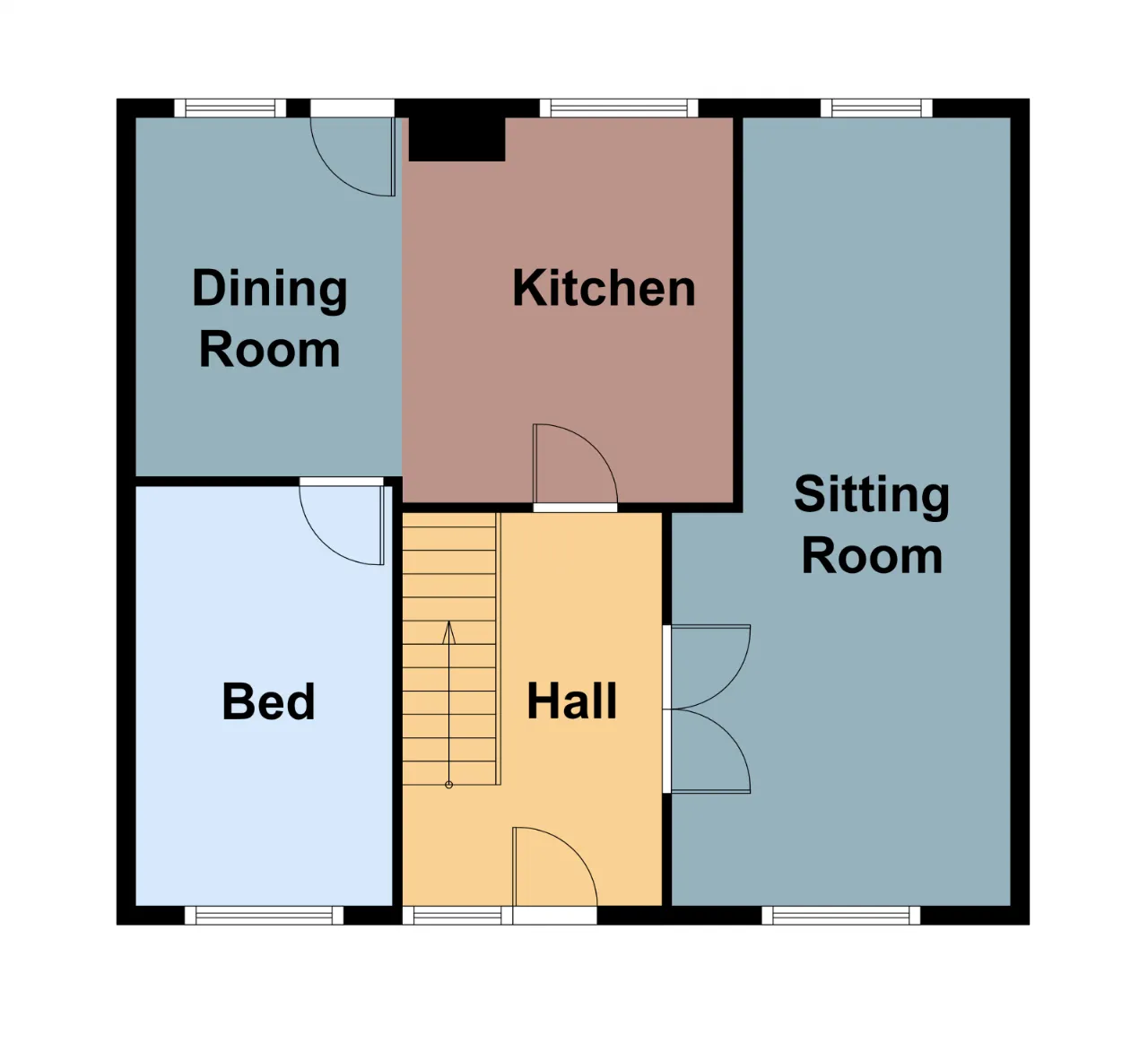 Kitchen / Dining Room 3.2m x 5.4m with tiled flooring throughout, tiled splashback, waist & eye level units. Two rear facing windows and glazed door to the rear. Access to downstairs bedroom.