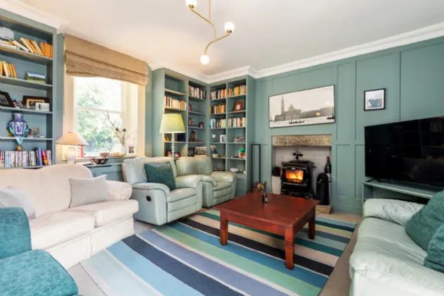 Returning to the entrance hall the staircase leads you down to the lower ground floor, where a patio door in the corridor opens to a beautifully enclosed courtyard at the rear of the house. As you continue along the corridor, you will pass a spacious WC before reaching the living room, a cosy, everyday space. The room is adorned with panelling and library-style shelving, and is warmed by a wood-burning stove, adding both comfort and character.
