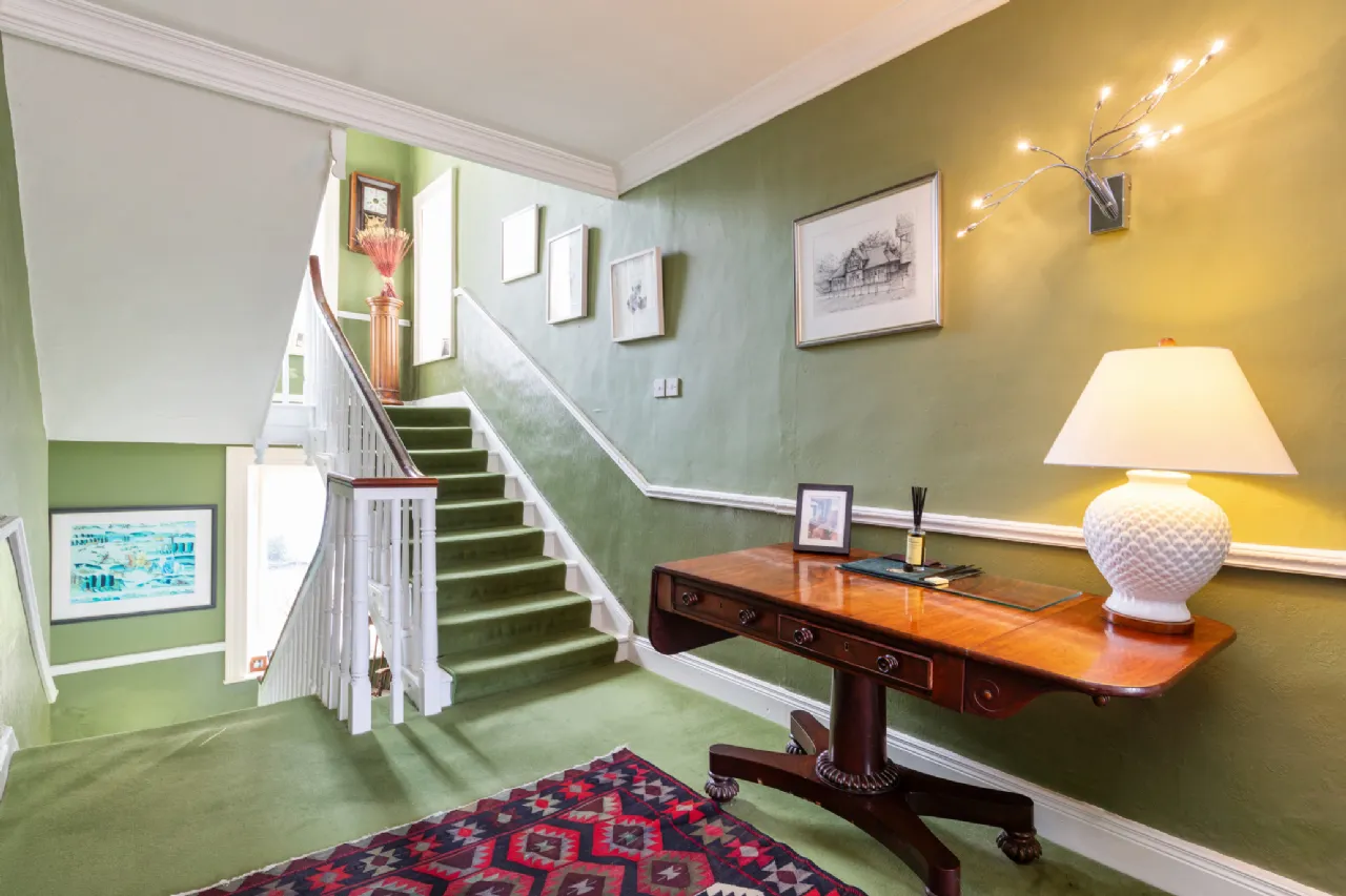 As you ascend the stairs to the first floor, the return landing leads to two generously sized double bedrooms and the main bathroom, which is equipped with a shower, toilet, bidet, and a free-standing bathtub. At the top of the stairs, there are two more spacious double bedrooms, both offering stunning views of the surrounding garden and parkland. One of these is the principal bedroom, which includes an ensuite bathroom with a toilet, shower, and vanity unit.