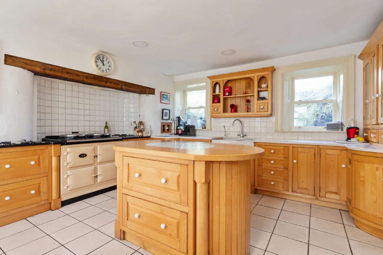 The stairs continue down to the basement, where you will find the kitchen. This traditional space features wooden cabinets, an island unit, a double Belfast sink, a gas hob, and a classic Aga. A door from the kitchen leads out to a walled garden at the side of the house. The basement also includes a couple of small rooms, ideal for storage or various other uses.