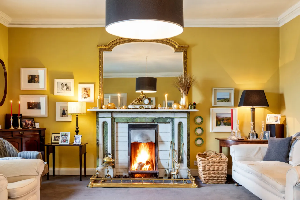 To the left, the drawing room offers a refined setting for entertaining, featuring a marble open fireplace that adds warmth and character. While two large sash windows, complete with original shutters, enhance the room’s grandeur.