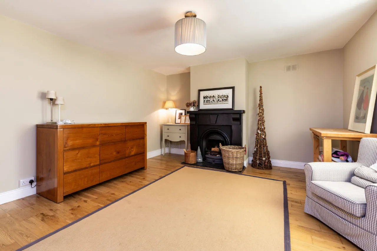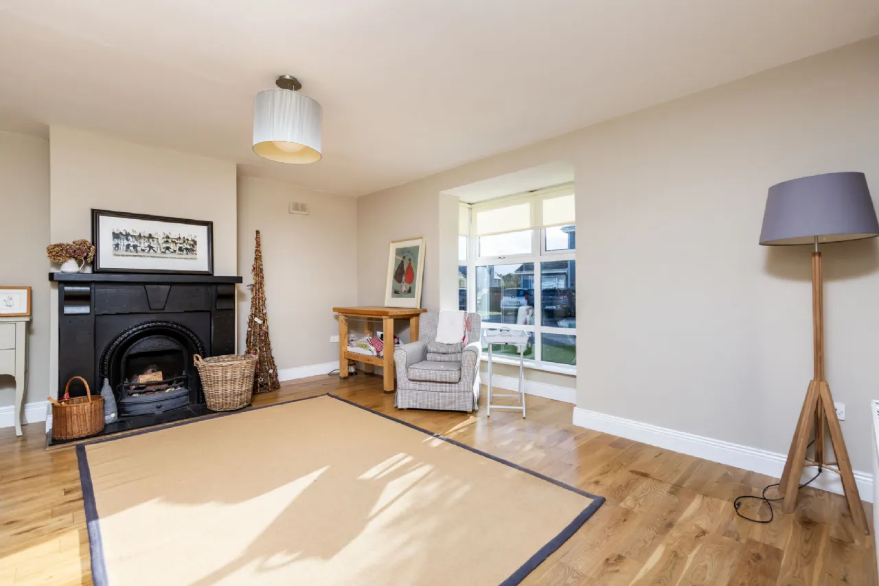 Sitting Room 4.4m x 5.15m Spacious room with Bay Window, Oak flooring, TV point, and open fireplace.