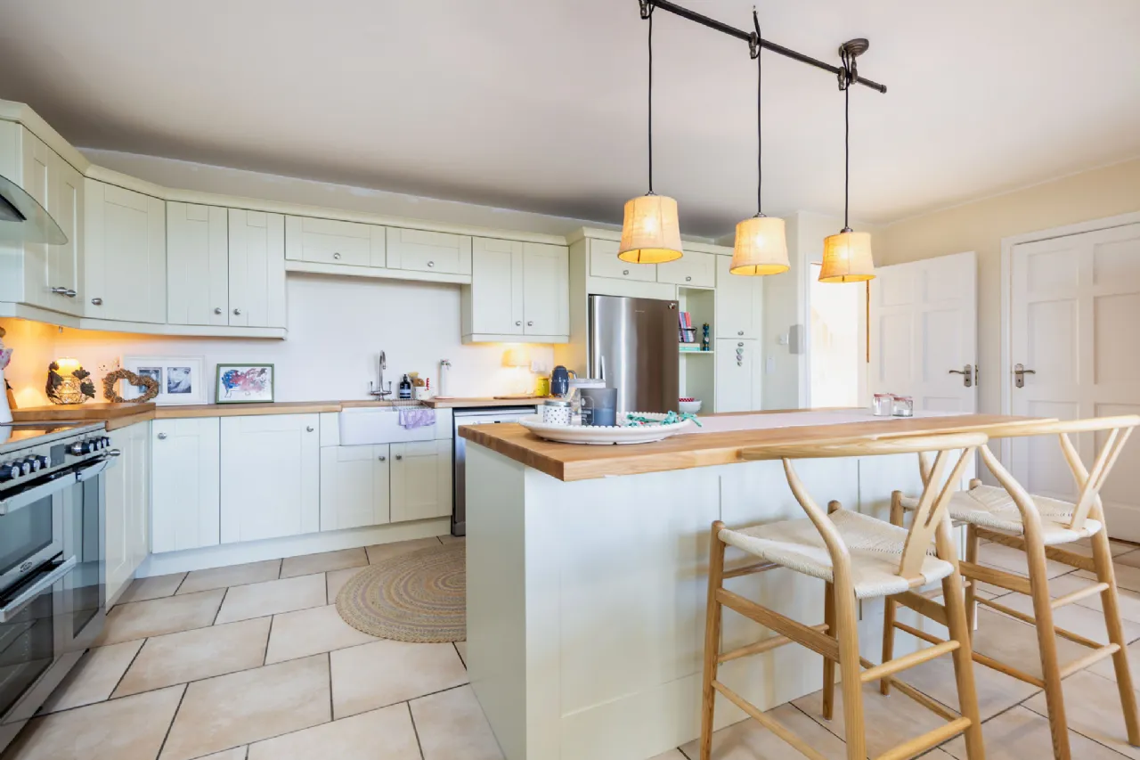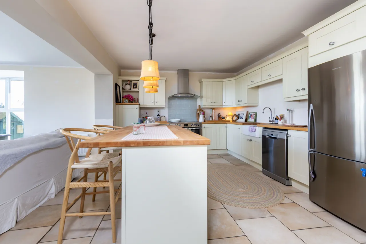Kitche - Dining Area Features tiled flooring and the recent addition of a beautiful bespoke kitchen with generous storage and a large breakfast - counter with built in storage. The kitchen opens up into the large living area.
