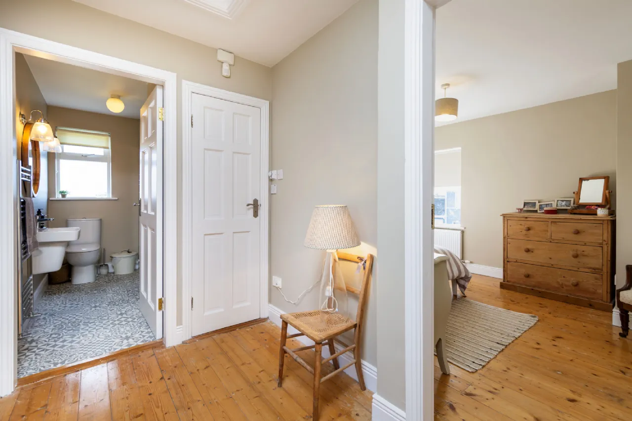 Bedroom One 3.4m x 5.0m With Oak flooring, backs onto the cloakroom so the creation of an ensuite could be an option. Would make a great office or playroom.