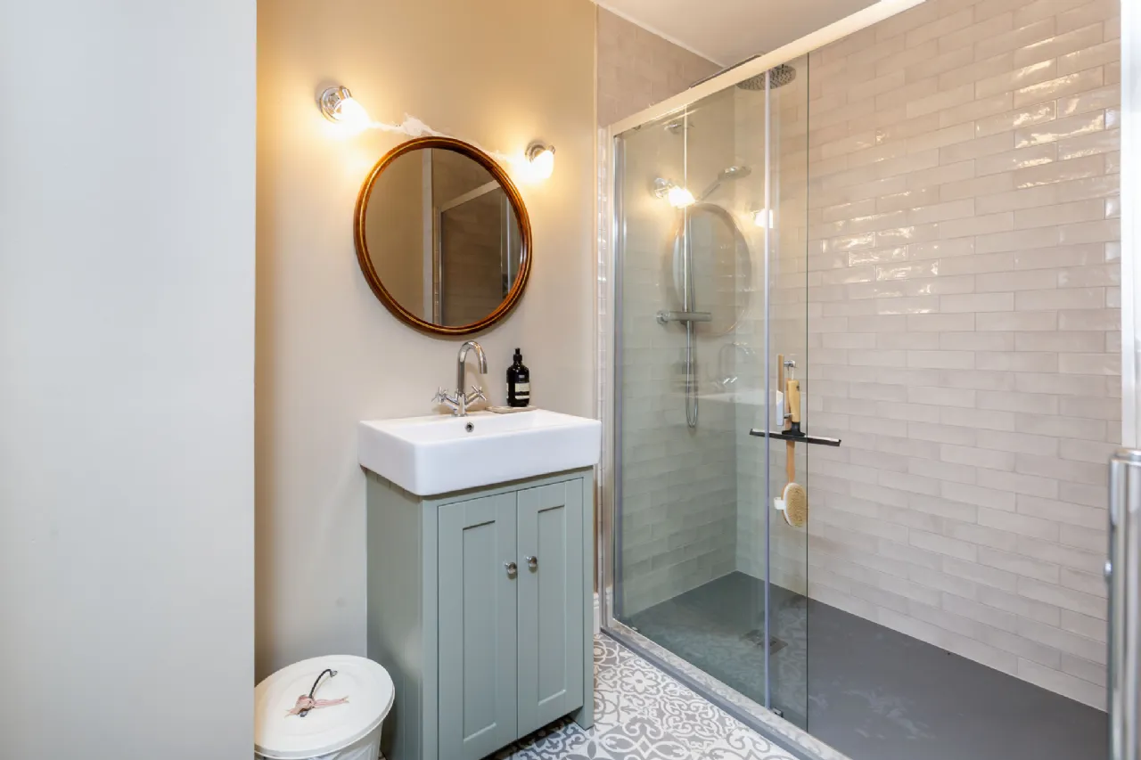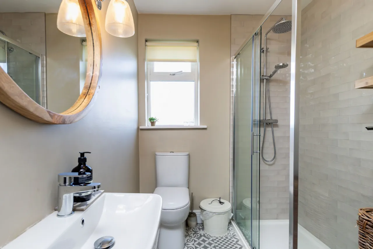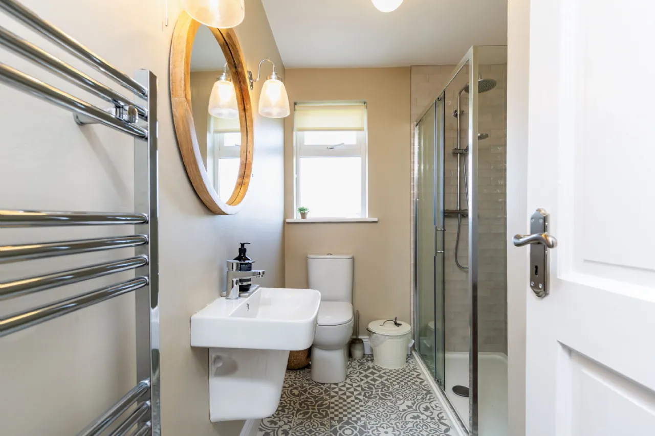 En-Suite 1.6m x 3.2m Spacious with tiled flooring and part tiled walls, large mains shower cubicle, w.c w.h.b and w.c.