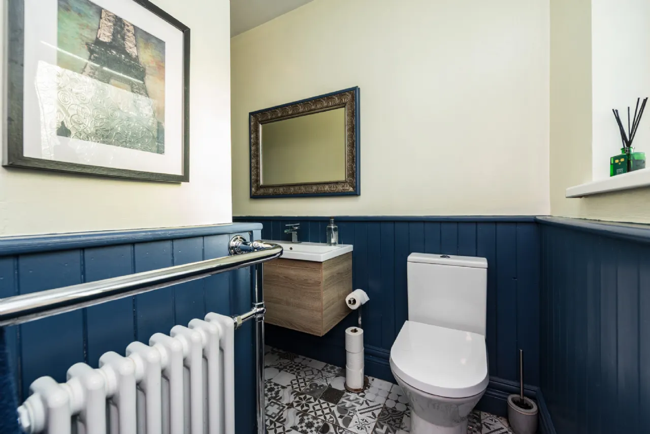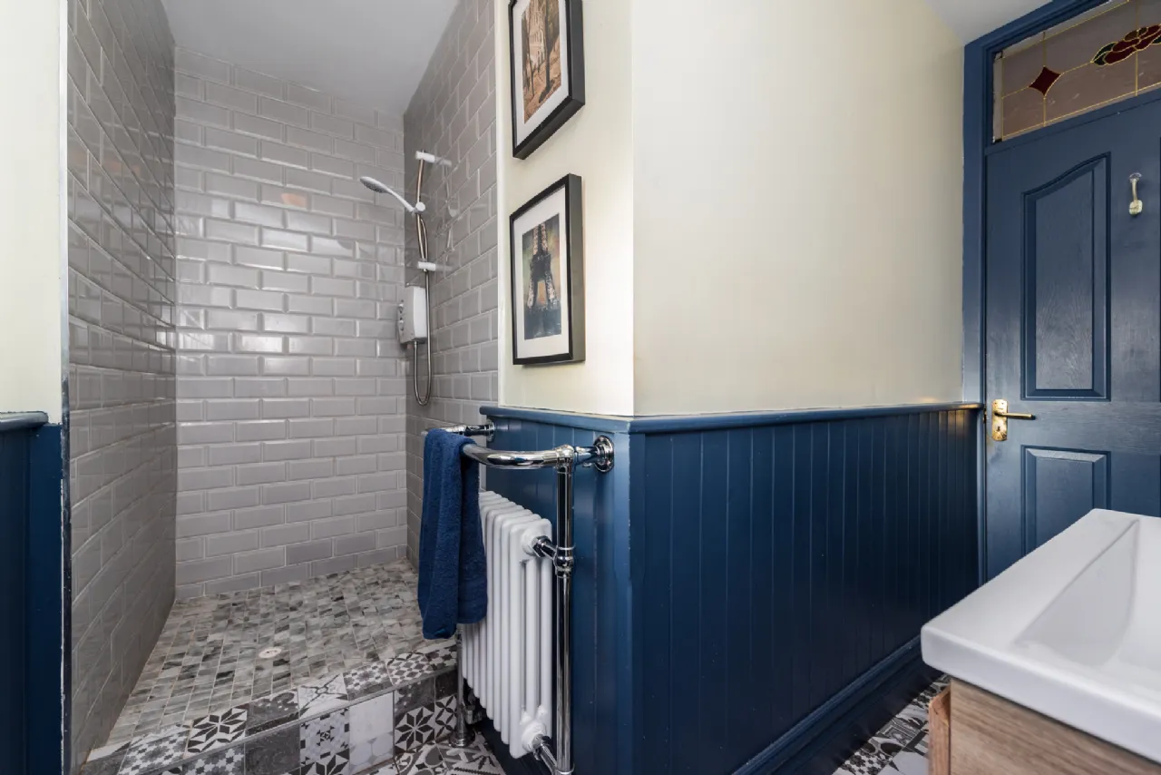 En-Suite 3m x 2.9m The en-suite has been recently refurbished and now boasts a stylish suite of low profile wc, wall hung vanity unit, heated towel rail and walk in shower with Triton electric shower. The room features wall panelling, and it has been beautifully tiled, with pattern tiling to floor, and mosaic and metro tiles in the shower.