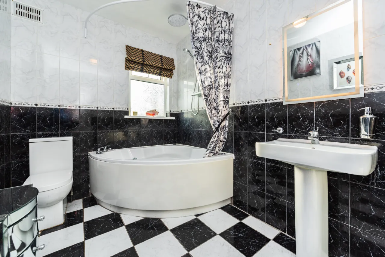 Bathroom 3m x 2.1m The family bathroom includes a modern suite of wc, wash hand basin, led mirror with demister and corner bath with jacuzzi and pumped shower with rainfall head and riser. It is fully tiled to floor and walls.