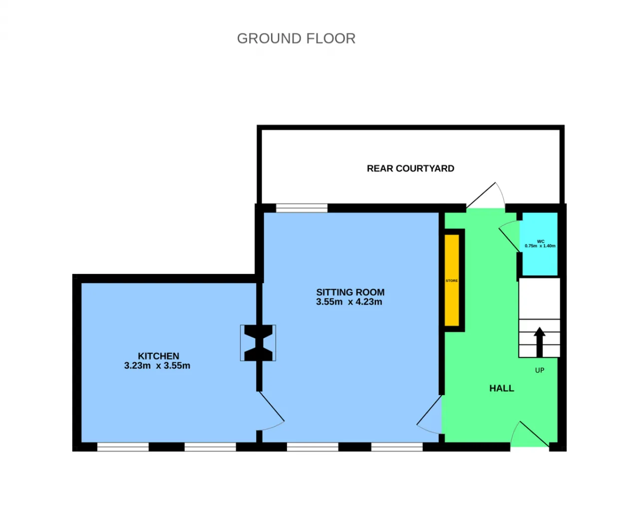 Sitting Room 3.55m x 4.23m Dual aspect room with solid oak flooring. Feature cast iron fireplace. Stained glass windows are set within original window frames as feature.