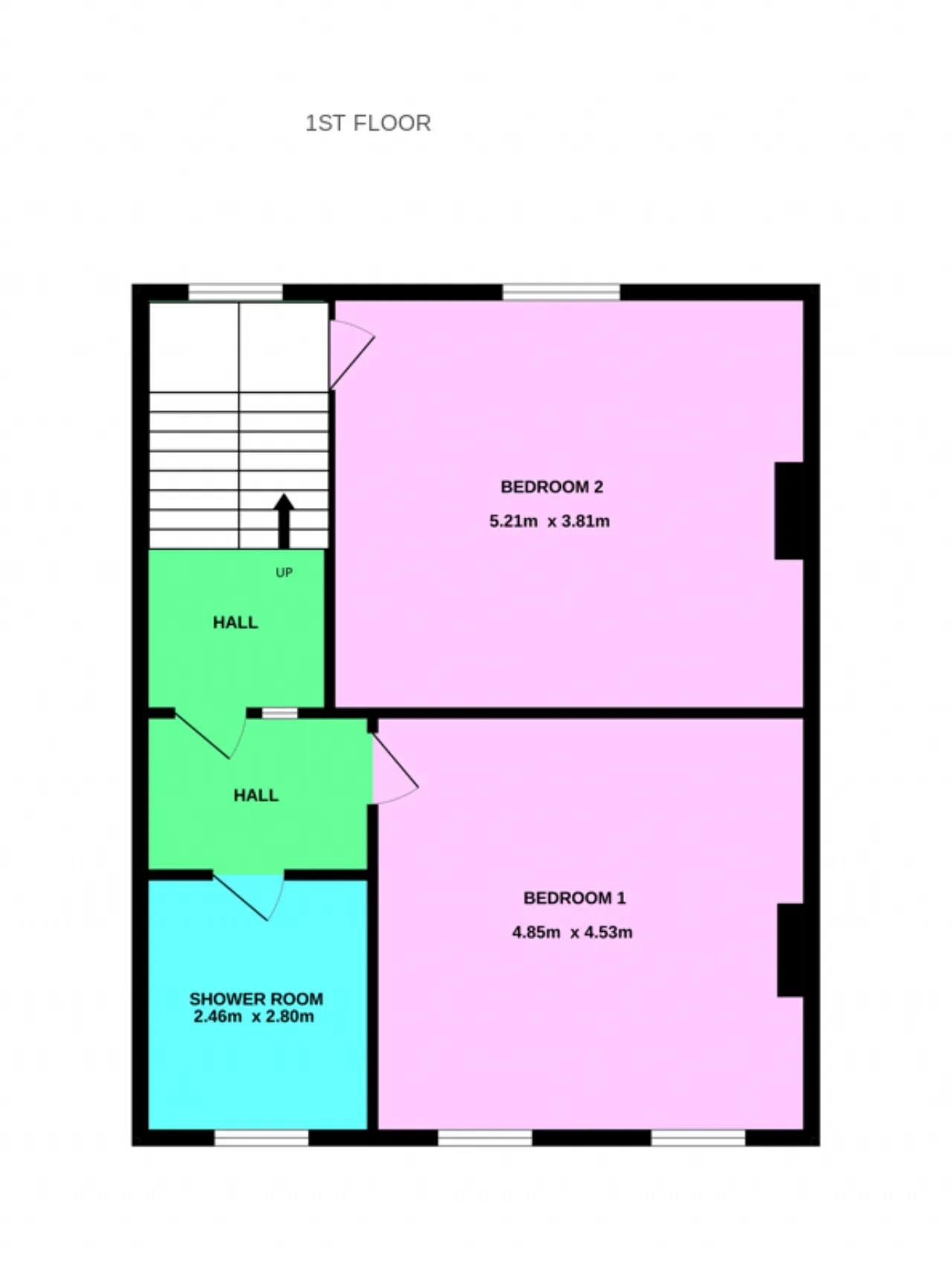 Back inside, the split level first floor incorporates two sizable double bedrooms. The impressive principal bedroom sits to front containing a 12ft high ceiling and eye-catching detailed plasterwork. Adjacent to the principal bedroom there is a contemporary shower room featuring attractive wall and floor tiles, and a his & hers sink. Climbing further, the second floor comprises another double bedroom, a modern bathroom, and a study area which is a necessity for today’s living.