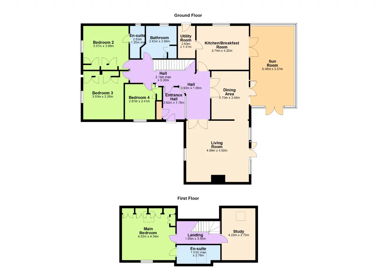 Arranged over two levels, the extensive accommodation was designed around maximising light, space and practicality. The accommodation briefly comprises of a welcoming front entrance porch, hallway, interconnected living room, dining room and fully integrated kitchen with access to a large sun room. There is a separate utility off the kitchen. At ground level there are three fine sized bedrooms, one with ensuite shower room and the family bathroom. Upstairs there is the extensive, dual aspect main bedroom, which is also ensuite and a large study room.