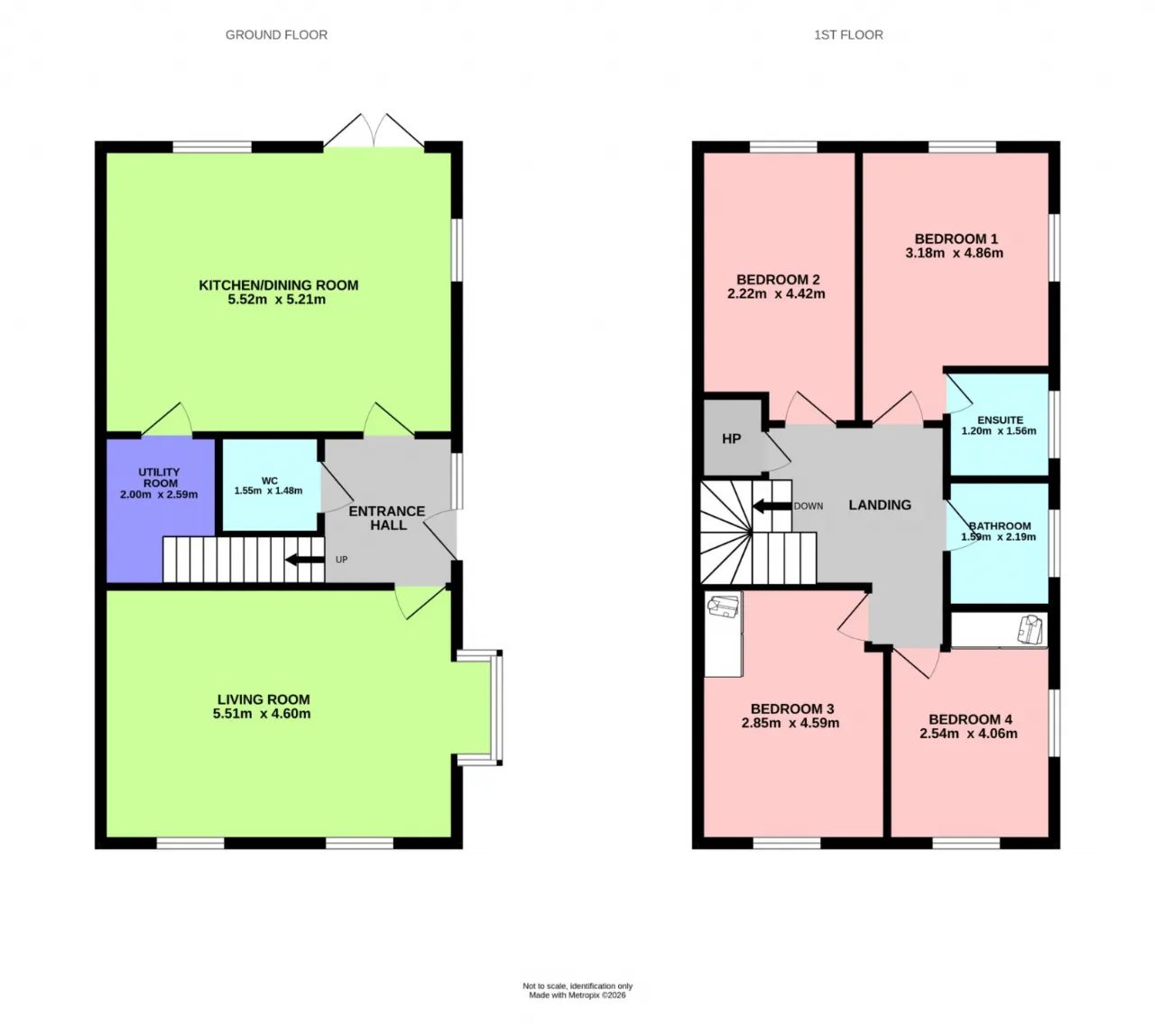 Downstairs WC 1.55m x 1.48m Tiled floor, WC, wash-hand basin, chrome heated towel rail, extractor fan.